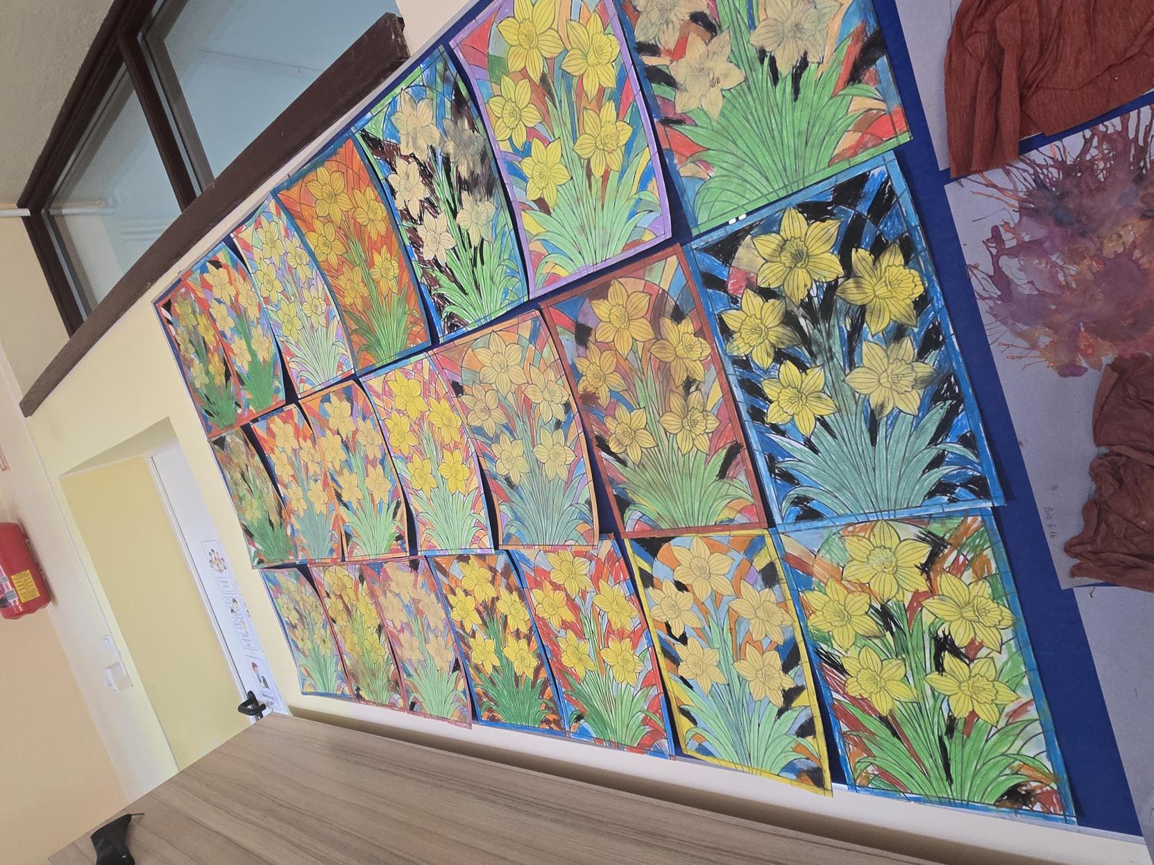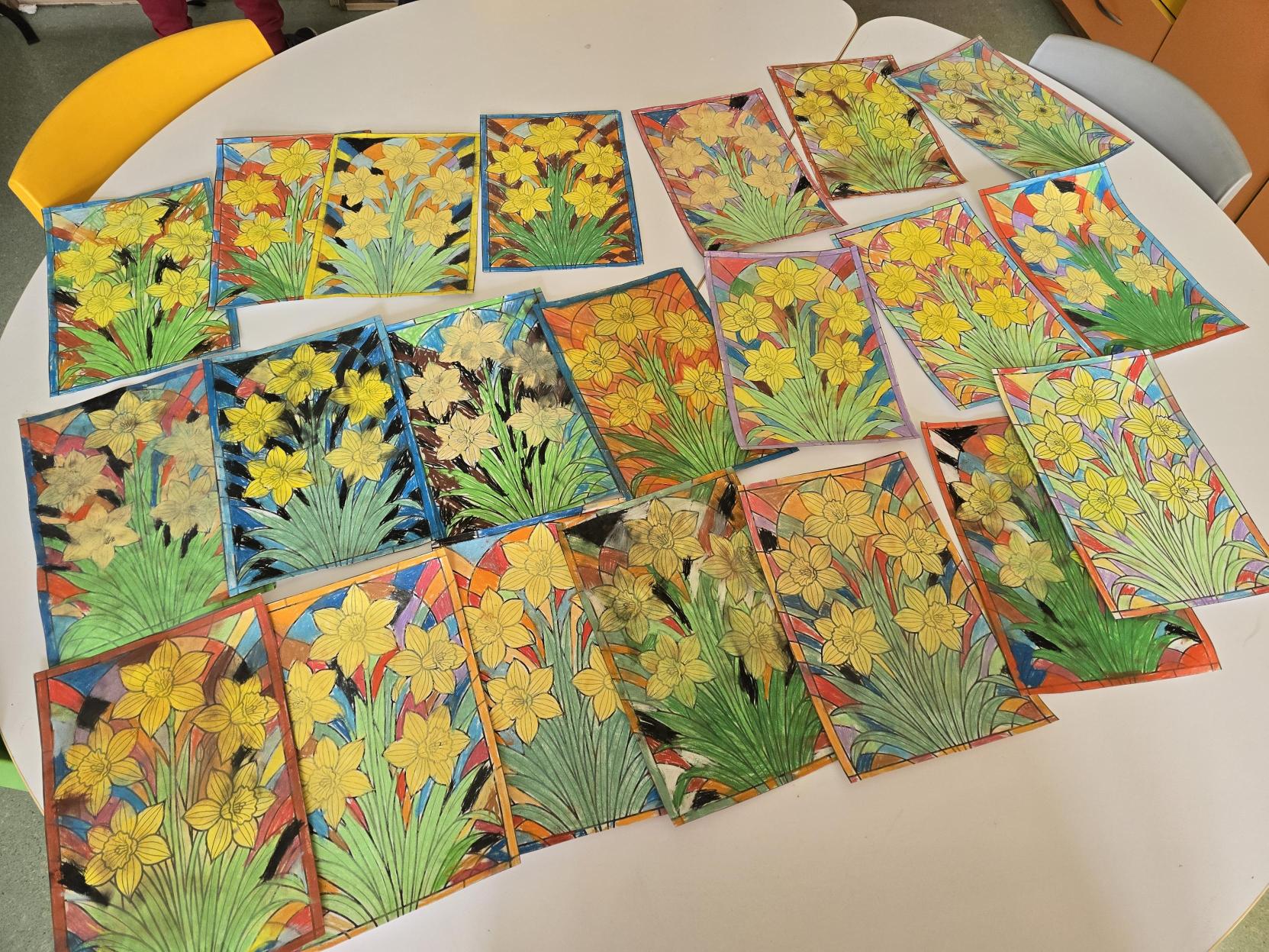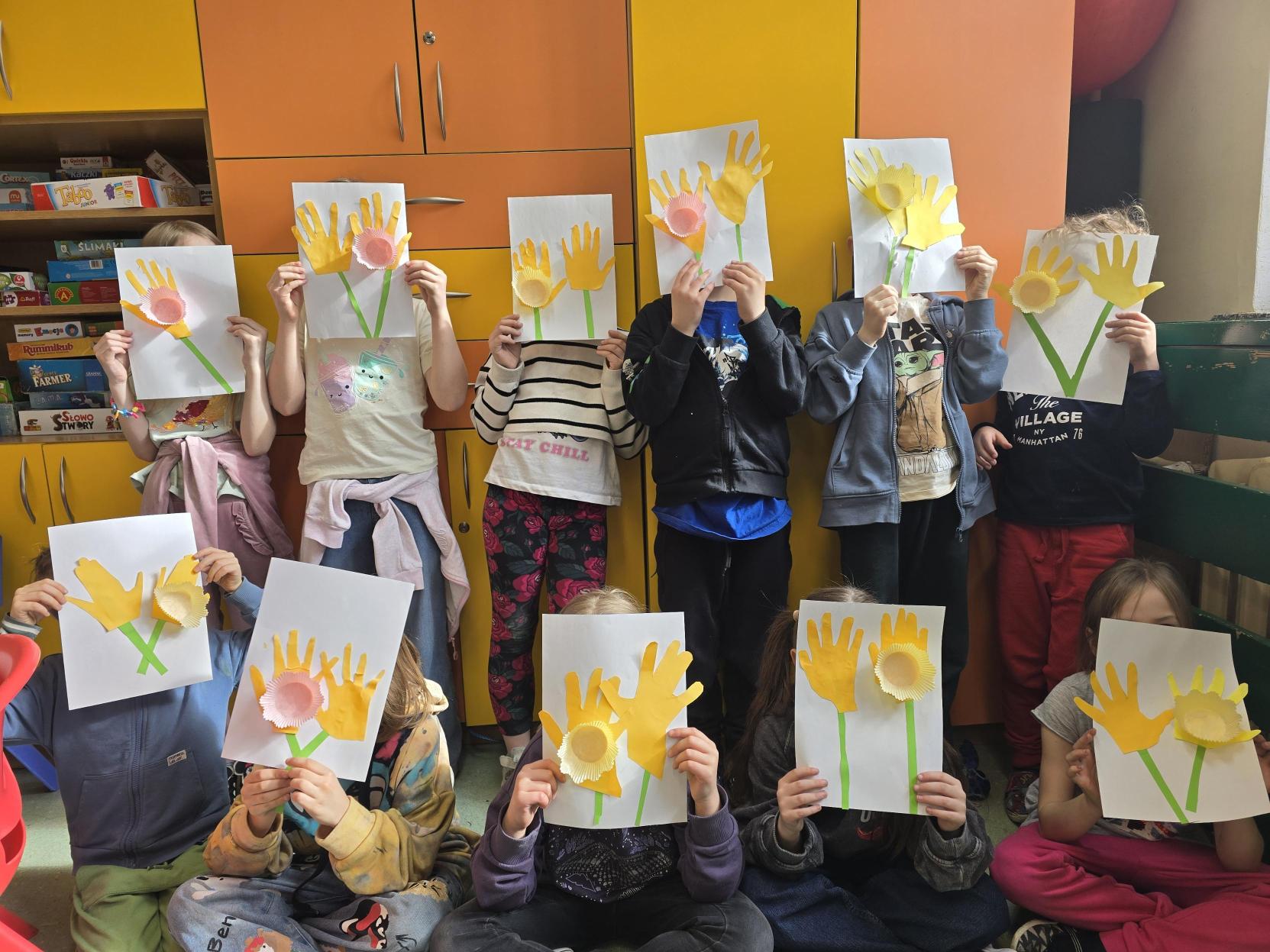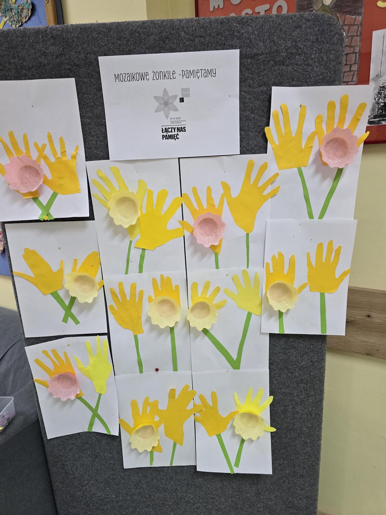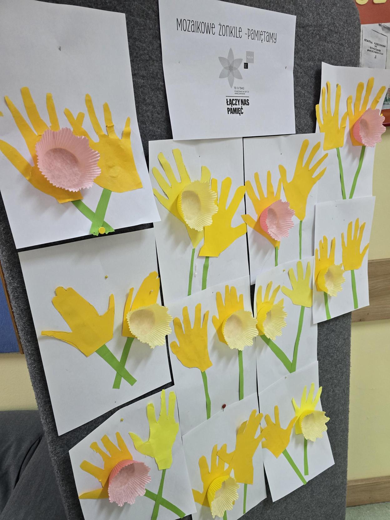 W ramach akcji "Żonkile" organizowanej przez Muzeum POLIN upamiętniającej rocznicę wybuchu Powstania w Getcie Warszawskim uczniowie klasy 1b wykonali w świetlicy pracę plastyczną inspirowaną symbolem żółtego żonkila. Centralnym motywem są żonkile, natomiast tło zostało wykonane w formie mozaiki, nadając całości ciekawy wymiar projektu. Akcja "Żonkil" symbolizuje pamięć, solidarność, szacunek i troskę o historię, która nie może zostać zapomniana. Ważne jest pielęgnowanie pamięci o wydarzeniach z przeszłości. W ramach drugiej akcji społeczno-edukacyjnej "Żonkile" Muzeum POLIN uczniowie wykonali prac plastyczną upamiętniającą rocznicę Powstania w Getcie Warszawskim. Na białych kartkach stworzyli kompozycje przedstawiające żółte żonkile. Każdy kwiat powstał z odrysowanych i wyciętych dziecięcych dłoni, które posłużyły jako płatki. W centrum znalazły się żółte papilotki tworzące trójwymiarowy środek.