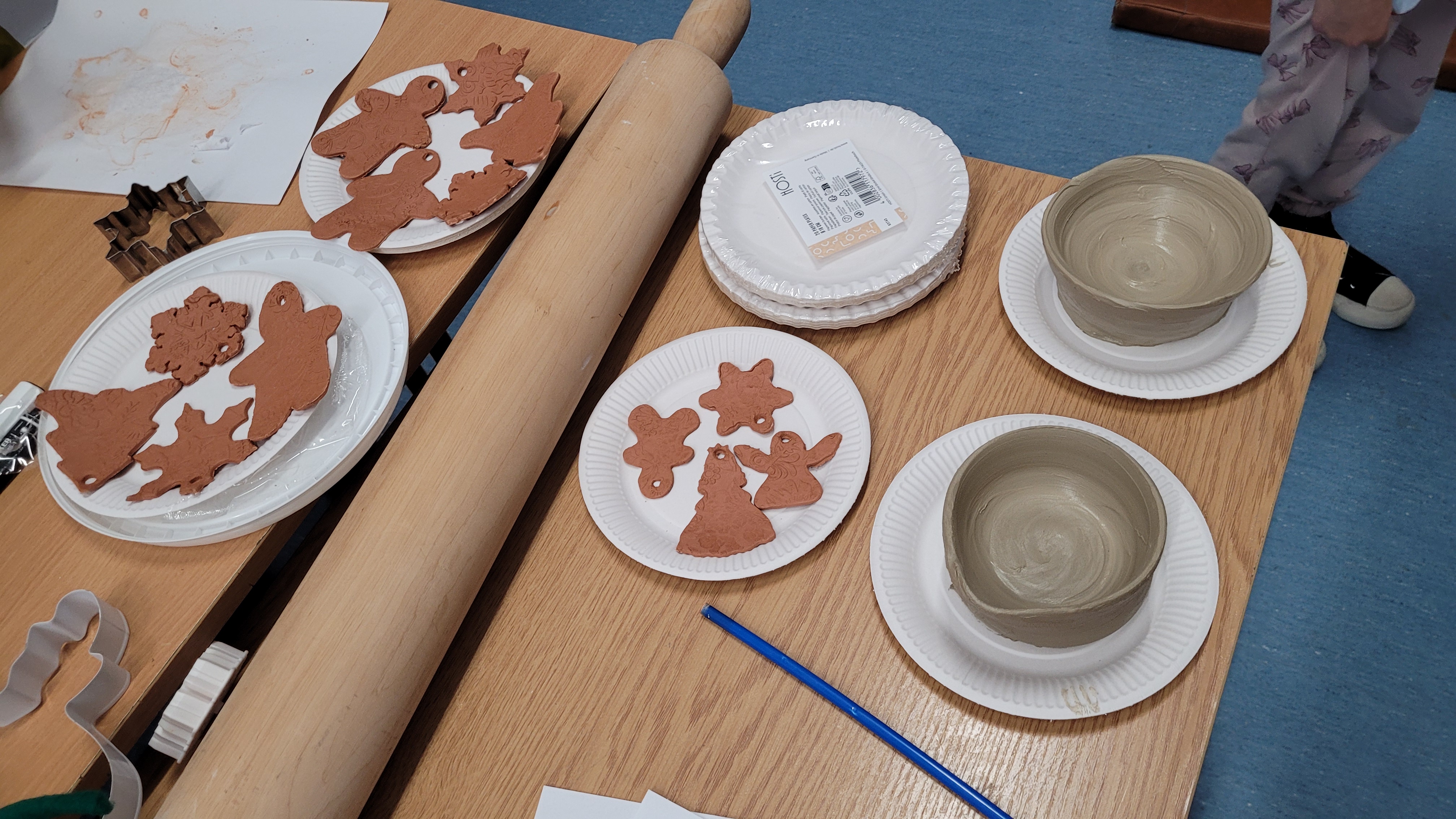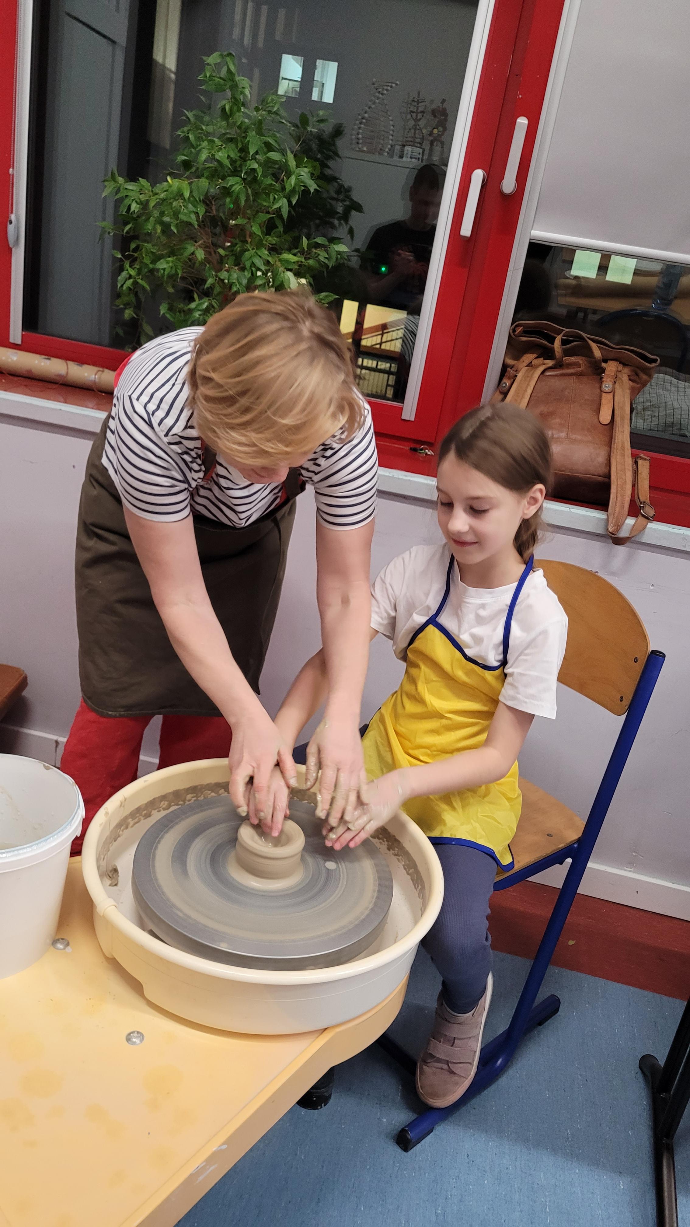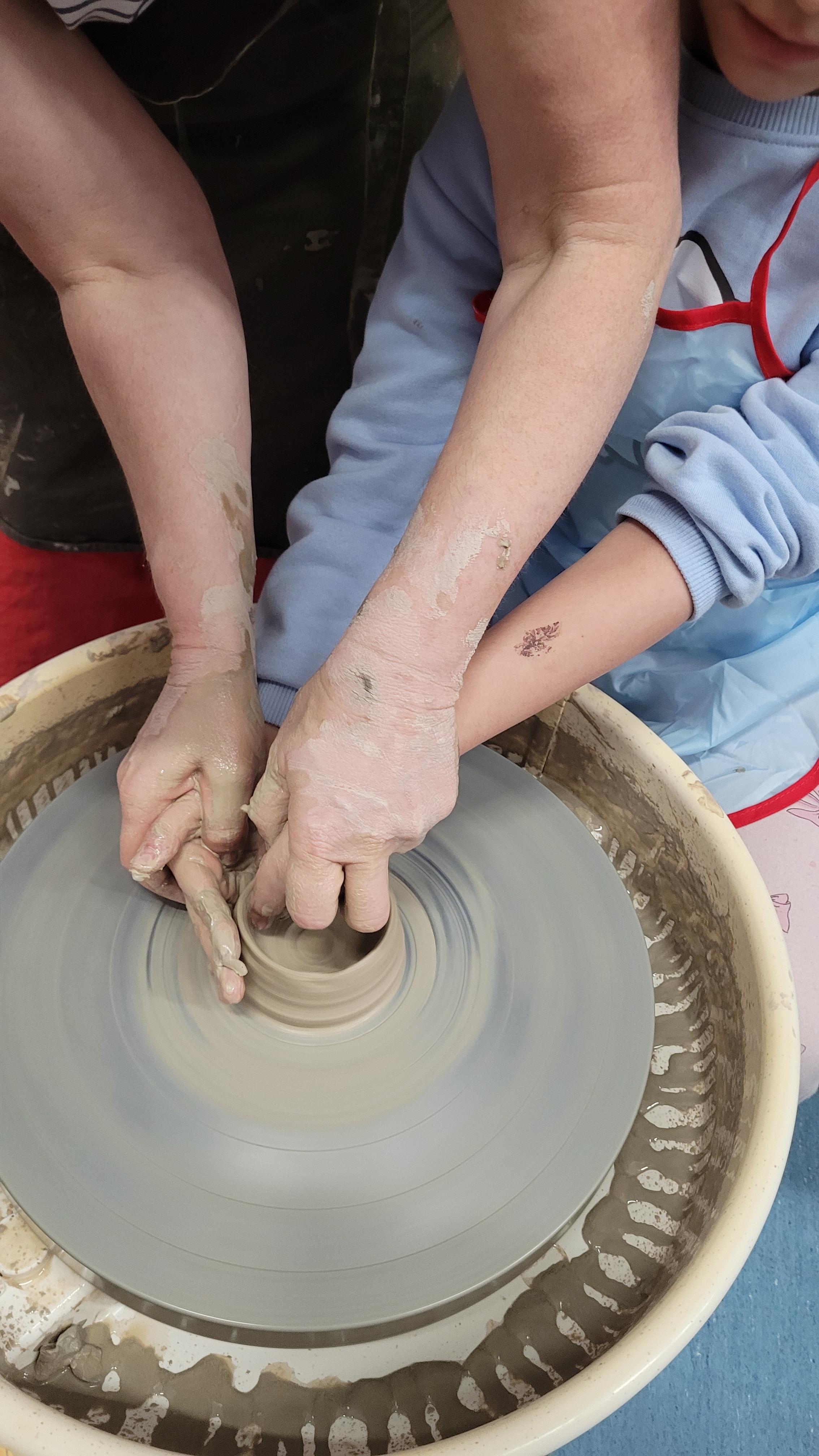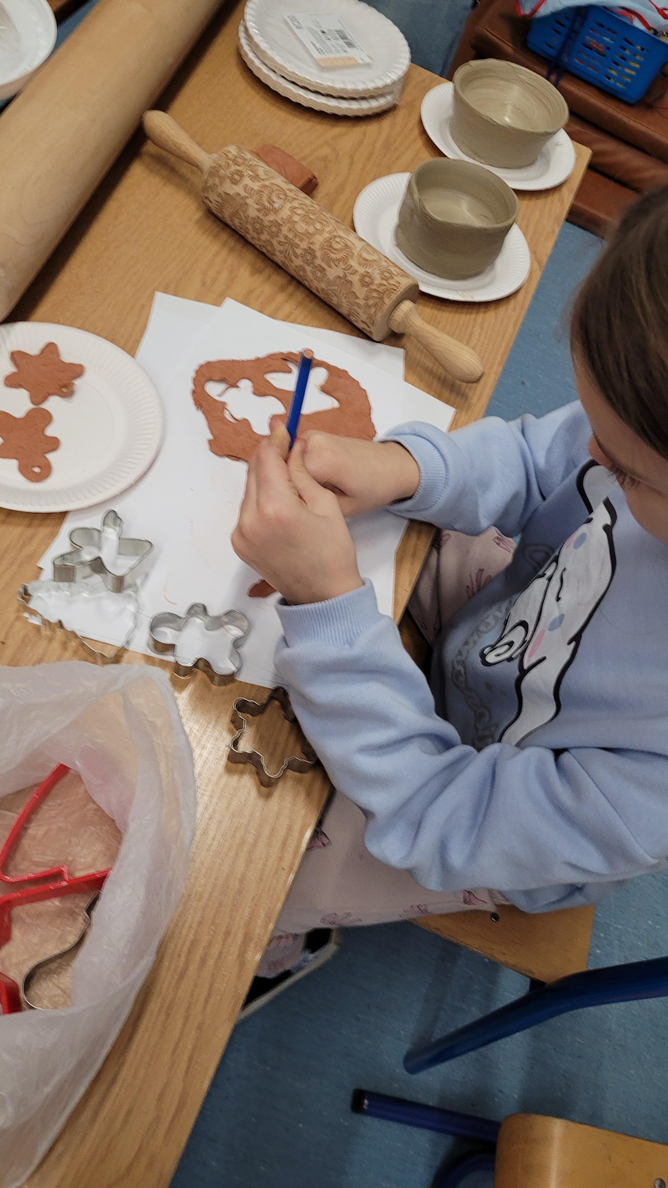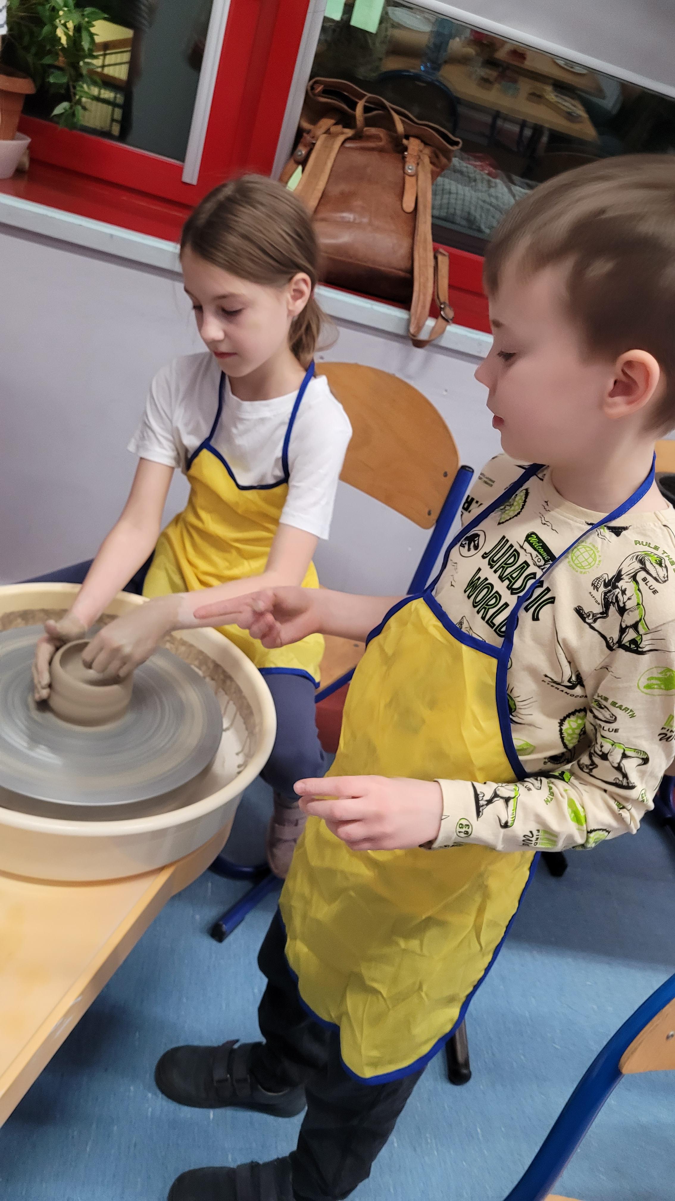 Jedną z najciekawszych atrakcji na szkolnym Kiermaszu Świątecznym były świetlicowe warsztaty ceramiczne pod kierownictwem Pani Elizy Sienkiewicz. Dzieci mogły stworzyć gliniane figurki, oraz przygotować gliniane zawieszki na choinkę - w ruch poszły foremki, wałki i mini szpatułki. Największym zainteresowaniem cieszyło się koło garncarskie. Można było spróbować swoich sił i stworzyć prawdziwe naczynia! Powstała przepiękna ceramika! Jej oryginalne formy i nowoczesny desing będą ozdobą świątecznych stołów. Dzieci doskonale się bawiły, dla większości z nich był to pierwszy kontakt z tego typu ekspresją artystyczną.
