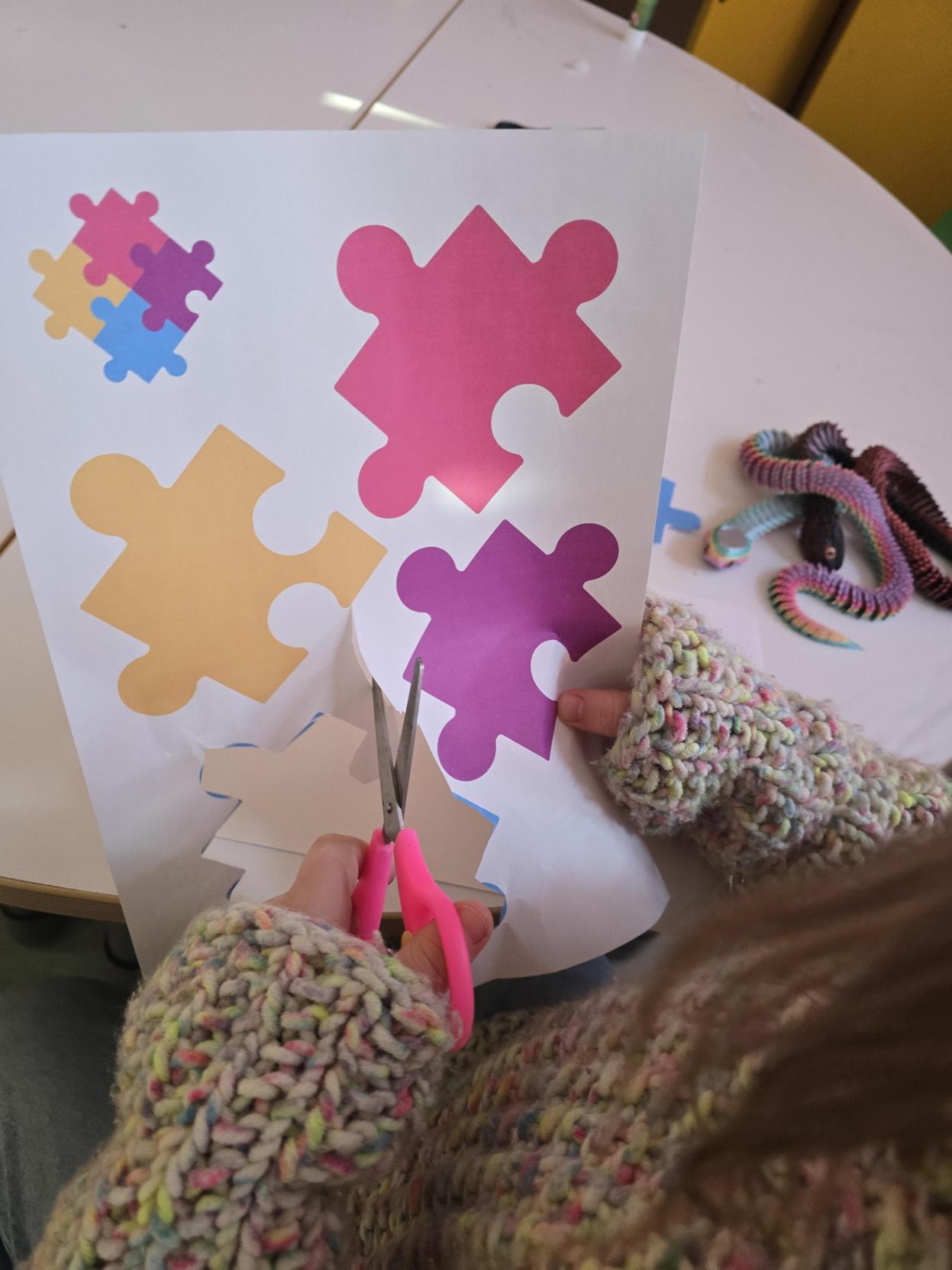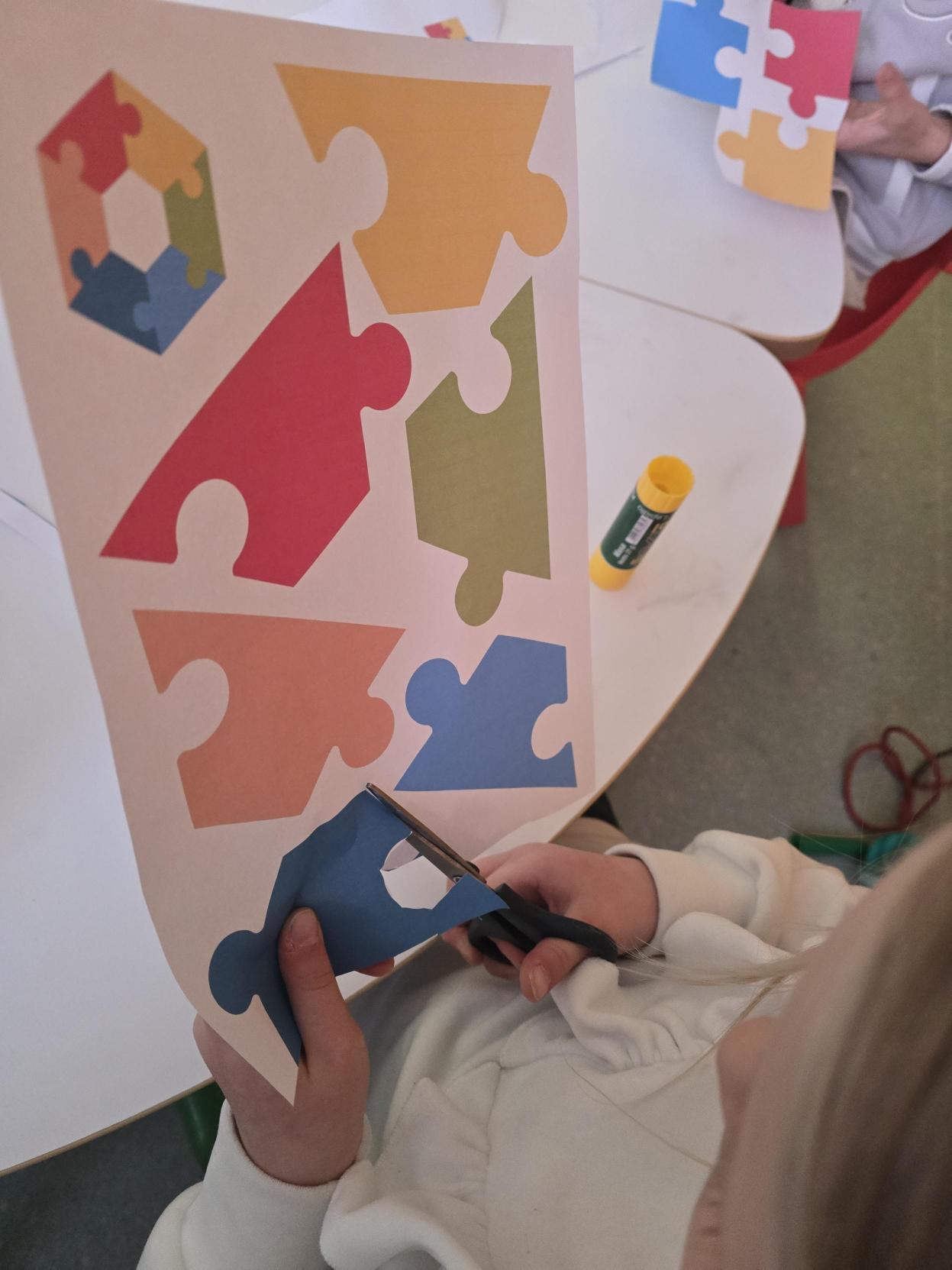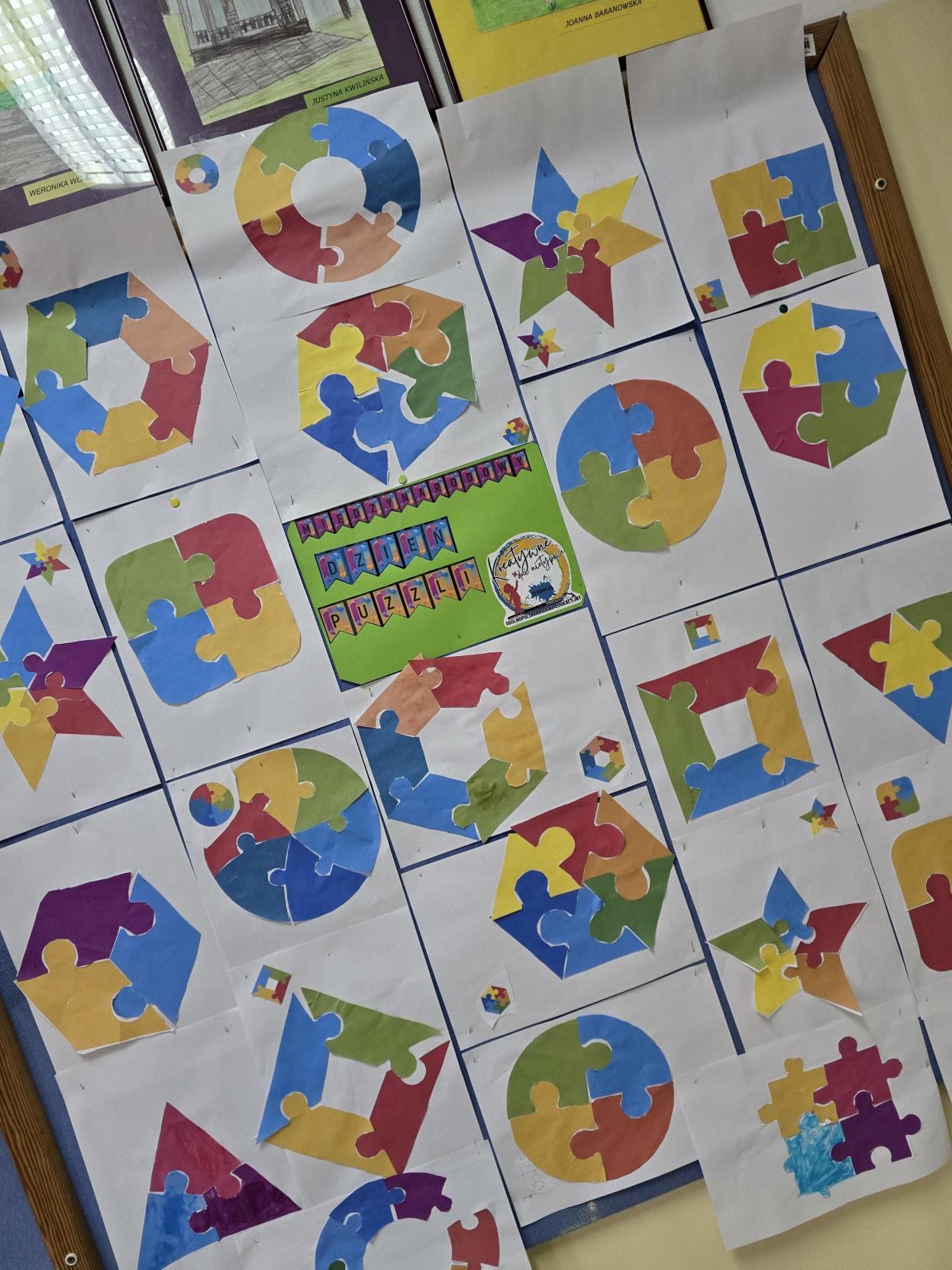 Z okazji Międzynarodowego Dnia Puzzli uczniowie tworzyli własne figury geometryczne z wcześniej własnoręcznie wyciętych elementów. Samodzielnie przygotowywali poszczególne części, a następnie łączyli je w całość, tworząc różnorodne kompozycje.