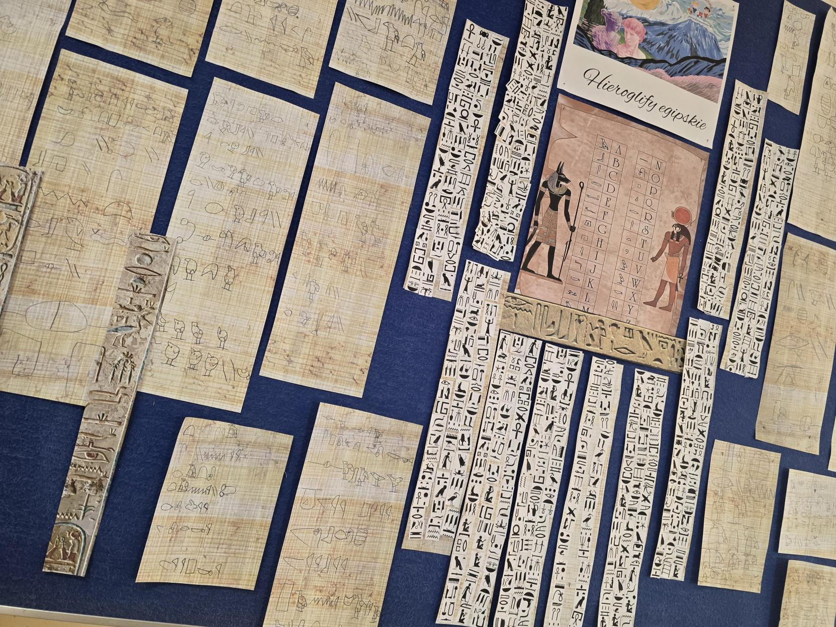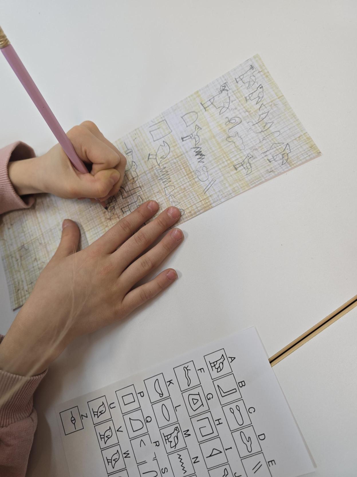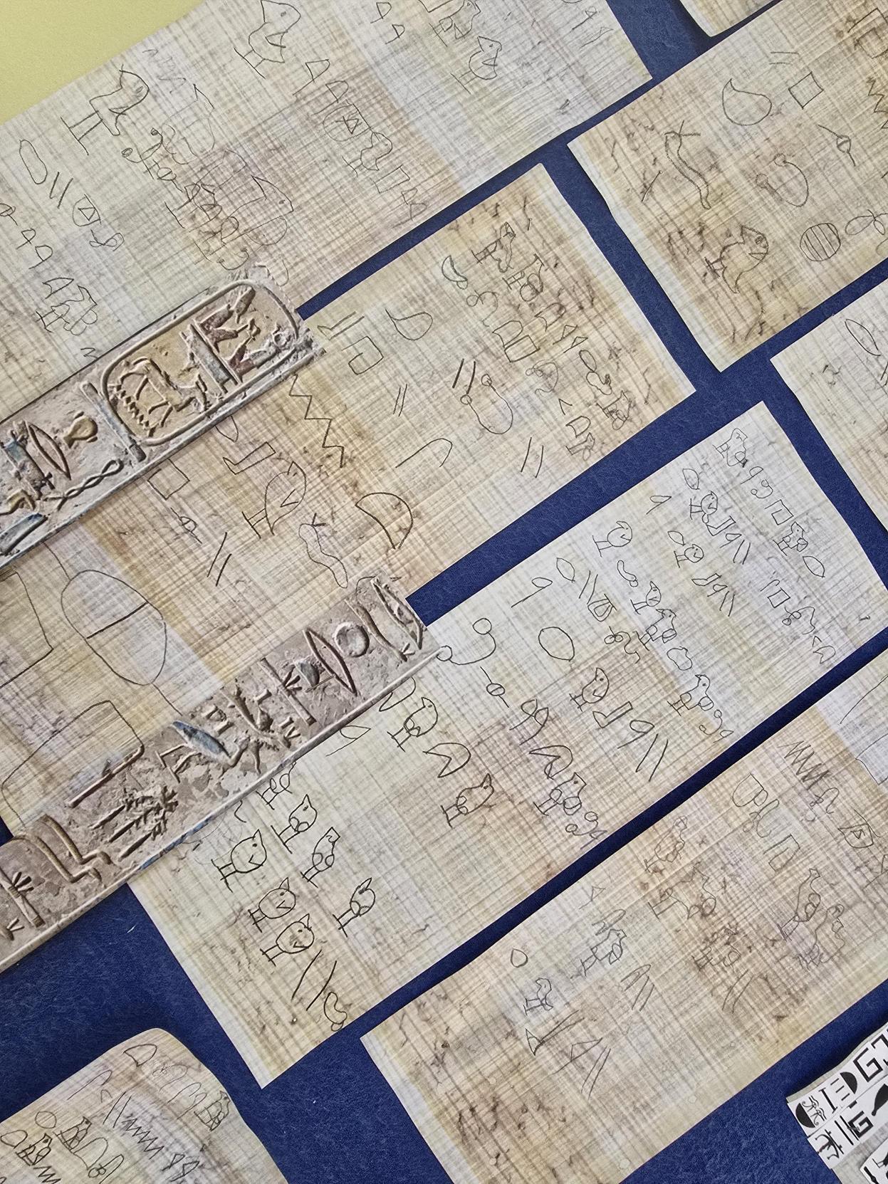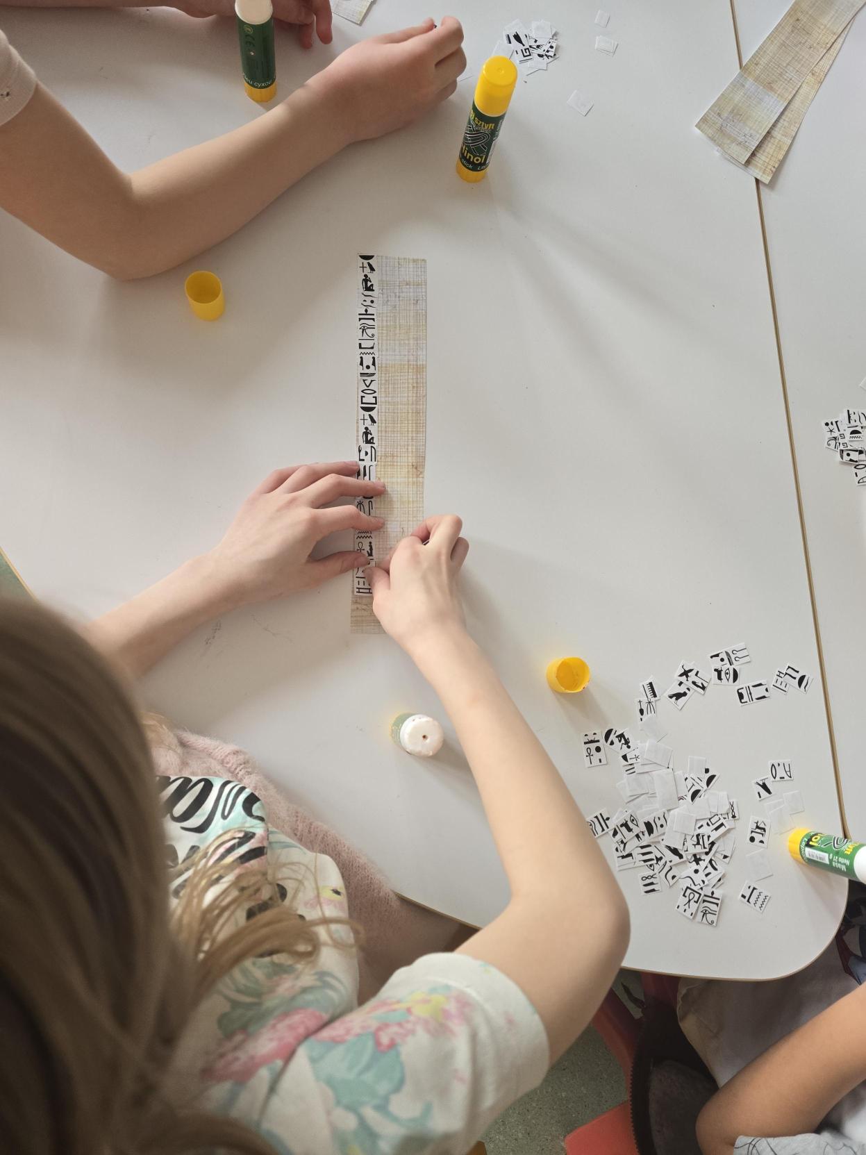 Pierwszy etap: Uczniowie poznali podstawy pisma hieroglificznego oraz jego znaczenie w kulturze starożytnego Egiptu. Wyjaśnienie uczniom, że służyły do zapisywania ważnych wydarzeń historycznych, dokumenty i aż po zdobienie świątyń i grobowców. Obejrzeli przykładowe inskrypcje, dowiedzieli się czym był papirus. Uczniowie tłumaczyli swoje imiona na symbole oraz tworzyli własne zapisy na papirusach. Dowiedzieli się w jaki sposób powstawały papirusy i z jakich roślin można je było uzyskać. rozwijając kreatywność, sprawność manualną i wyobraźnię.