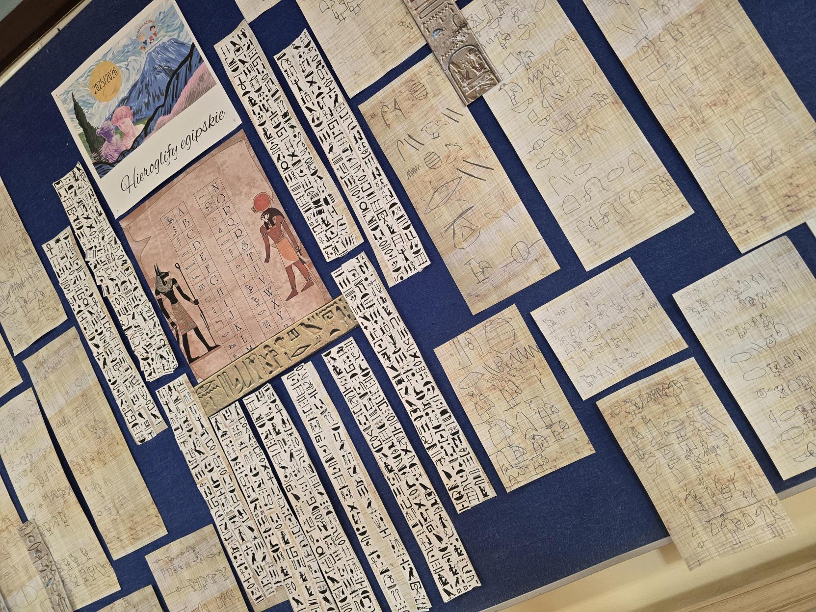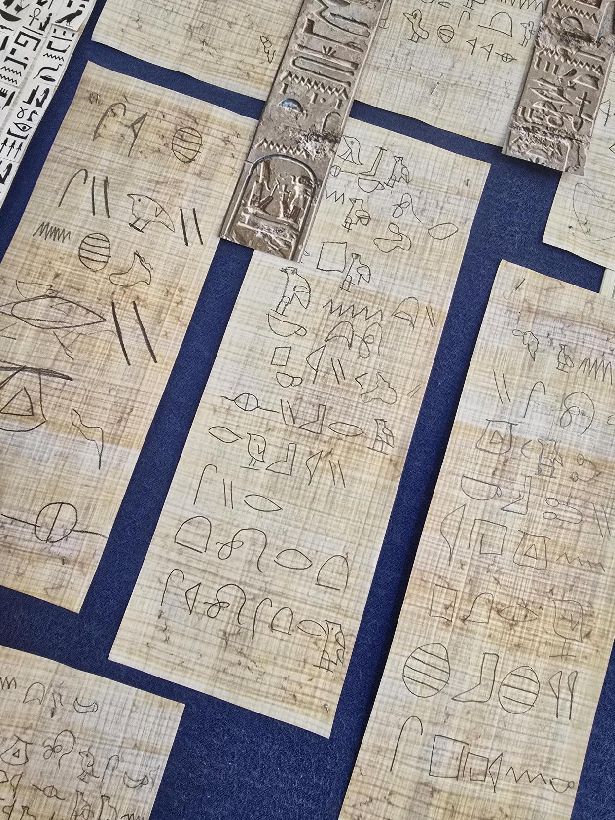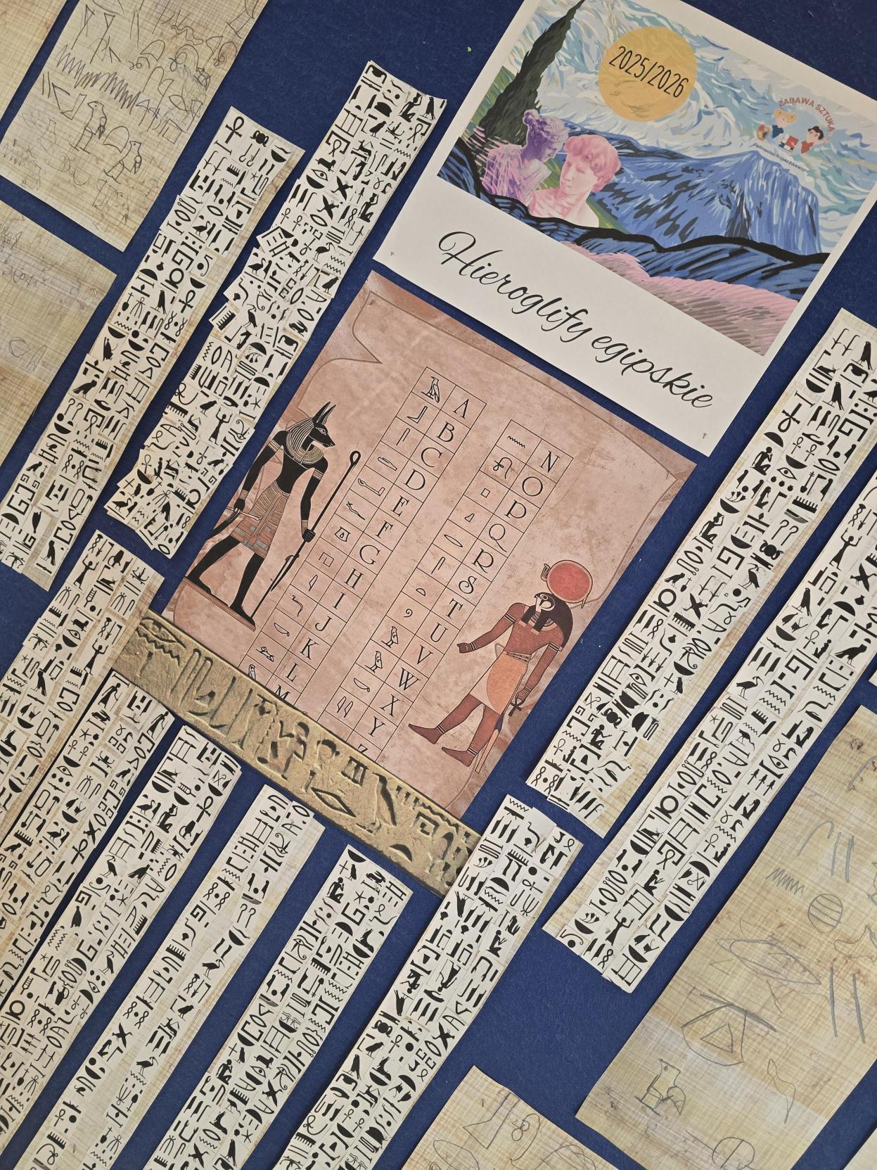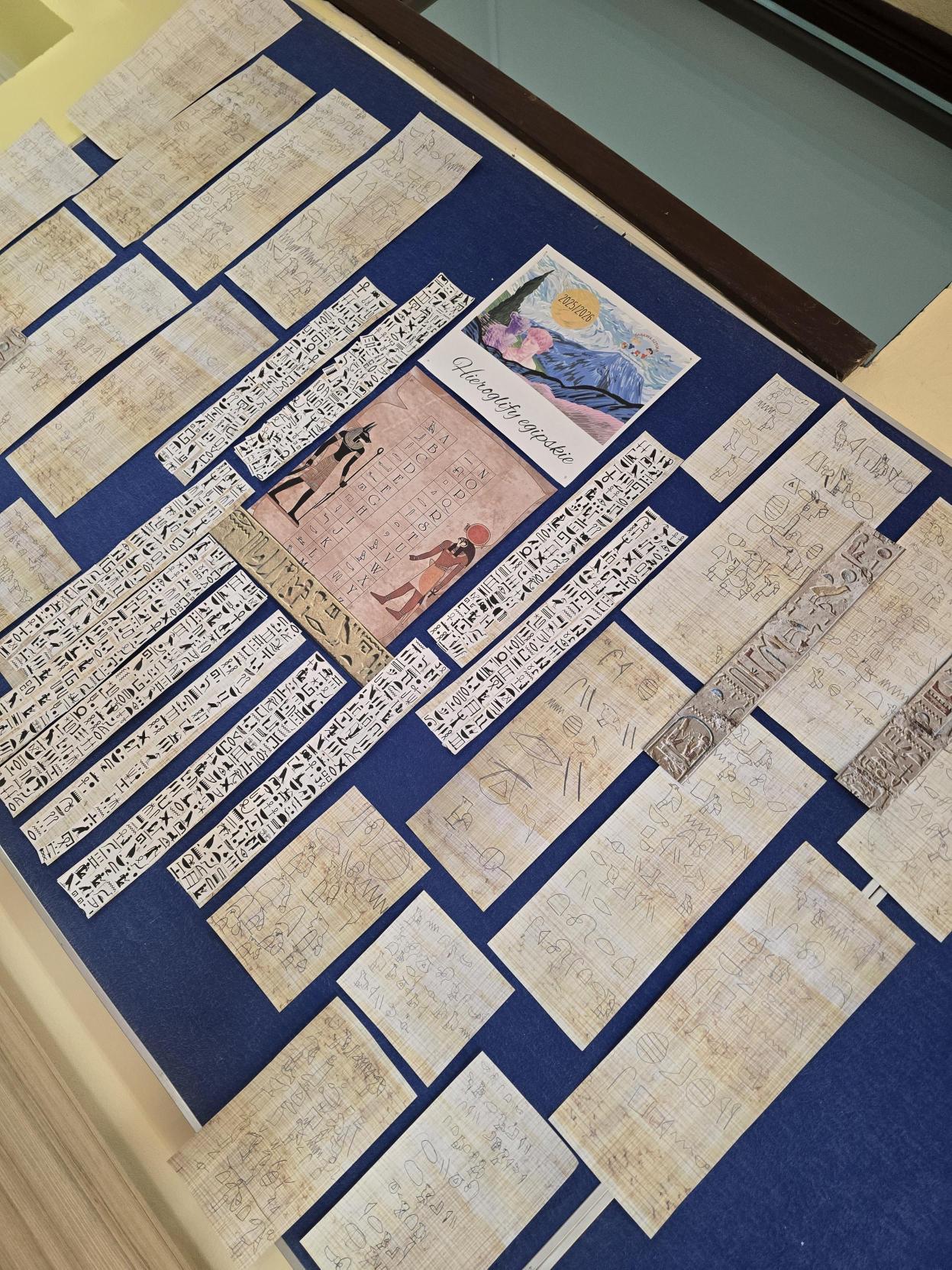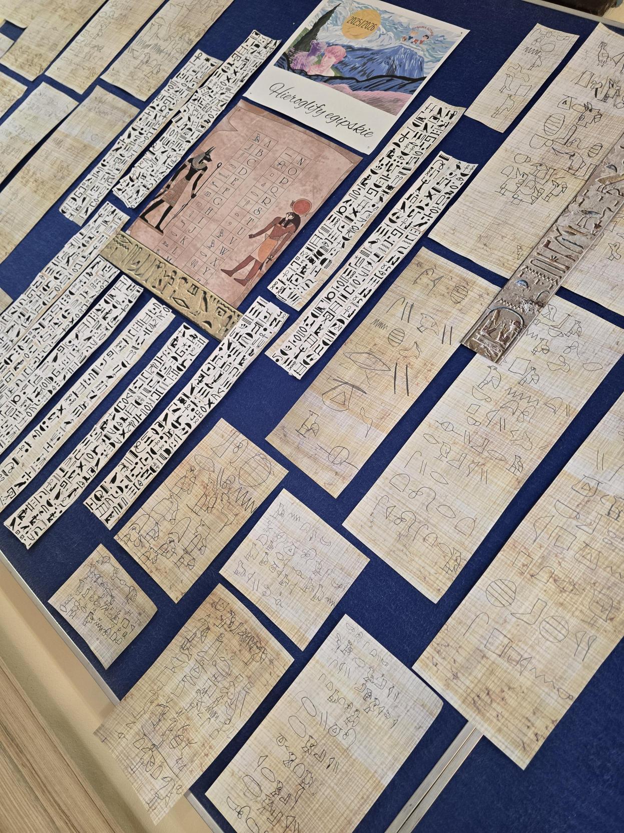 Pierwszy etap: Uczniowie poznali podstawy pisma hieroglificznego oraz jego znaczenie w kulturze starożytnego Egiptu. Wyjaśnienie uczniom, że służyły do zapisywania ważnych wydarzeń historycznych, dokumenty i aż po zdobienie świątyń i grobowców. Obejrzeli przykładowe inskrypcje, dowiedzieli się czym był papirus. Uczniowie tłumaczyli swoje imiona na symbole oraz tworzyli własne zapisy na papirusach. Dowiedzieli się w jaki sposób powstawały papirusy i z jakich roślin można je było uzyskać. rozwijając kreatywność, sprawność manualną i wyobraźnię.
