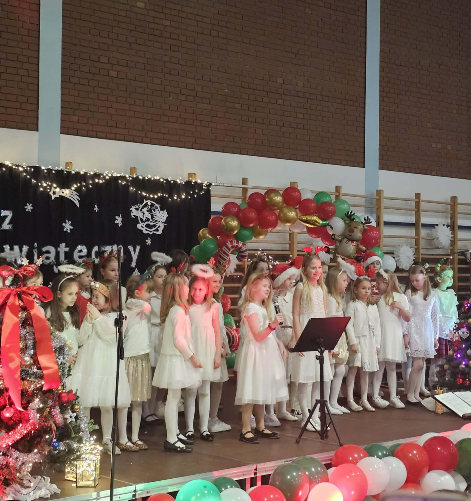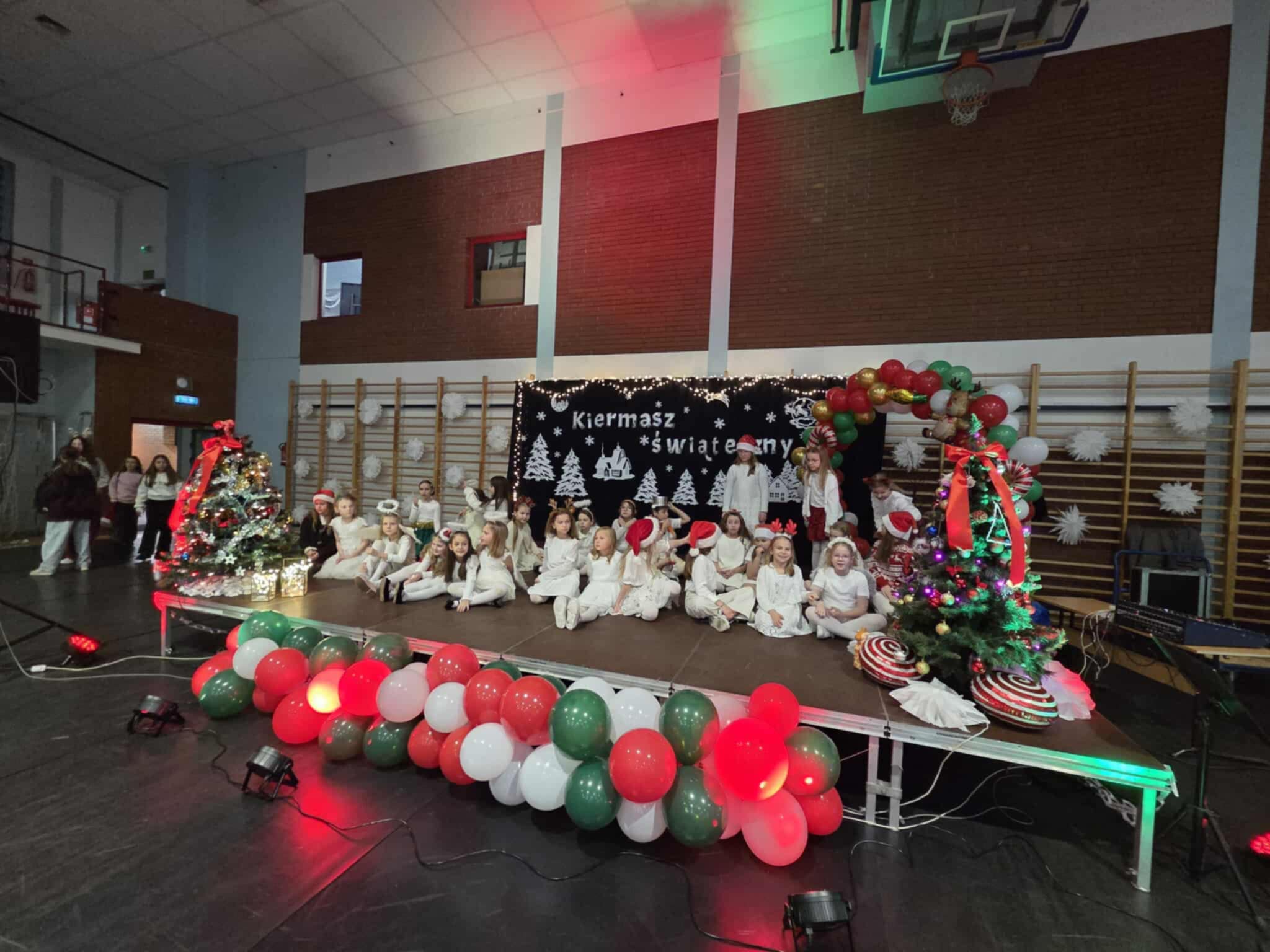 9 grudnia w naszej szkole odbył się wyjątkowy Kiermasz Świąteczny, który od samego wejścia otulał zapachem pierników, migoczącymi światełkami i prezentową atmosferą. Uroczyste rozpoczęcie o godzinie 16:00 poprowadziła Pani Dyrektor, która w tym roku wystąpiła w roli Mikołajowej – w czerwonym stroju, z uśmiechem i ogromną serdecznością. Po powitaniu gości zaprosiła wszystkich na wyjątkowy występ chóru klas 1–3 oraz 4–8, który zaprezentował się zarówno w odsłonie świątecznej, jak i rozrywkowej. Muzyka popłynęła prosto z serc naszych młodych artystów, zachwycając publiczność i wprowadzając wszystkich w atmosferę ciepła i radosnego oczekiwania na Święta. Następnie scena należała do klasy 3a, która przedstawiła pełne humoru i wzruszeń przedstawienie bożonarodzeniowe. Wśród zgromadzonych...pojawił się On – Święty Mikołaj!