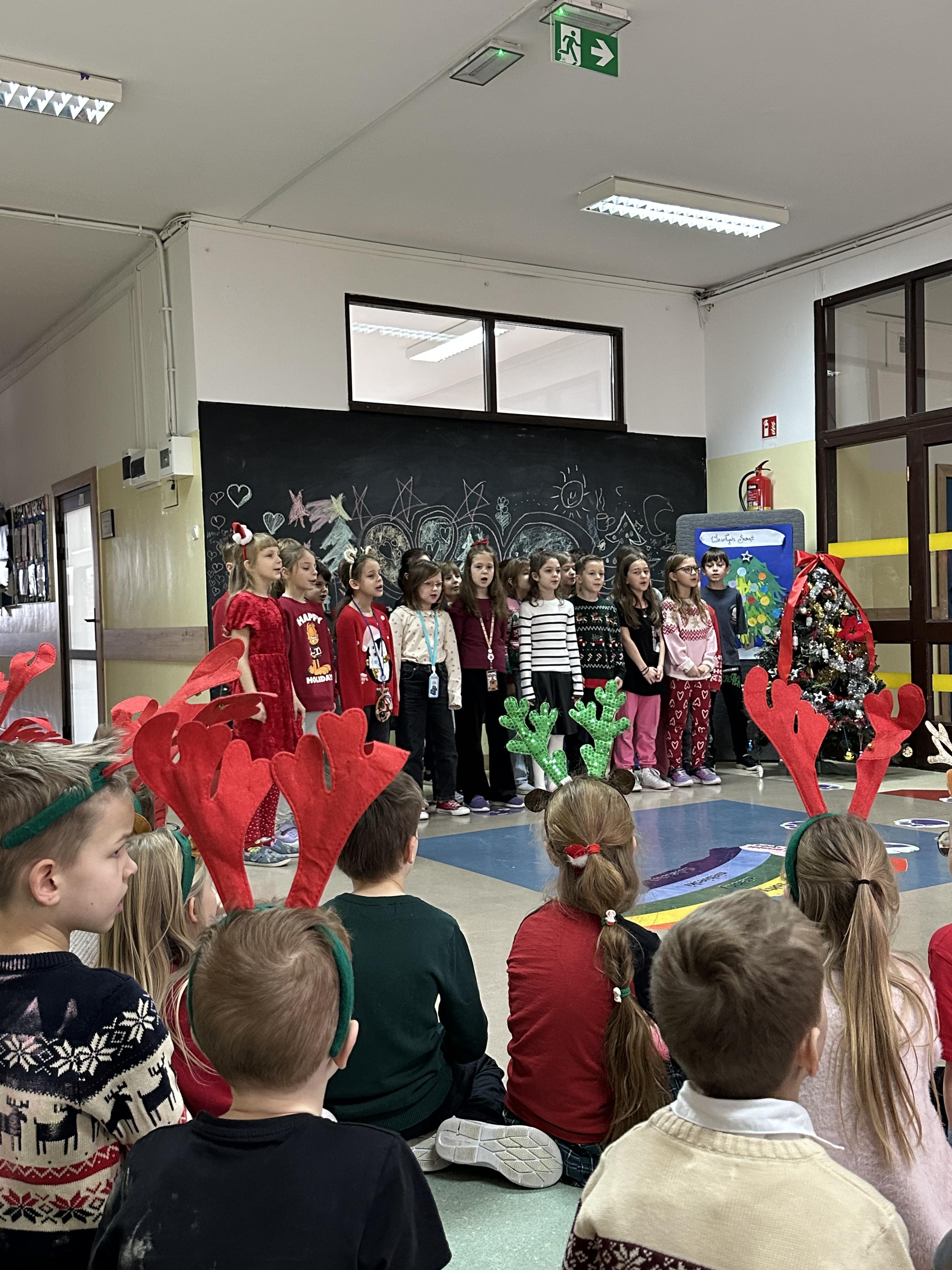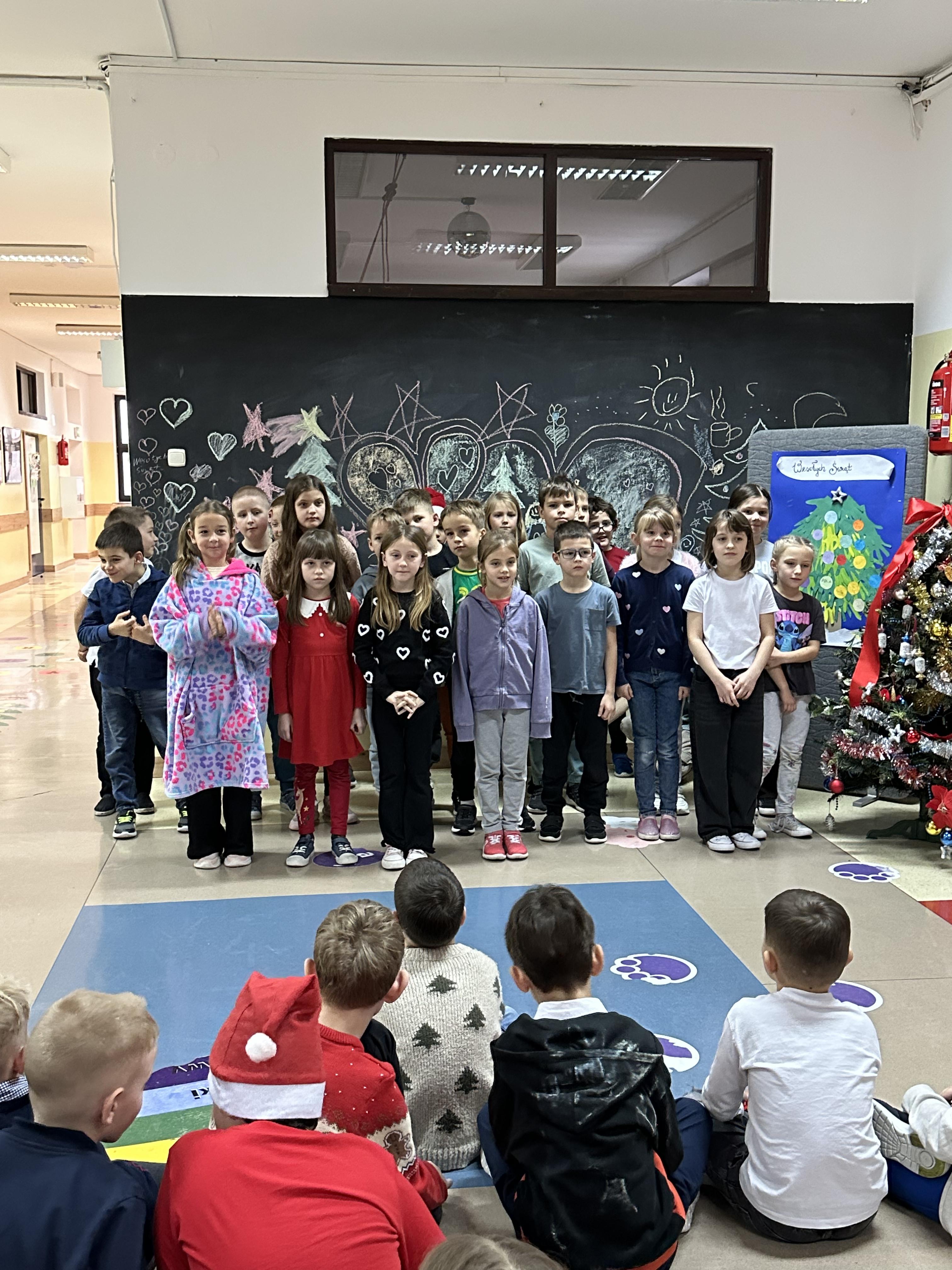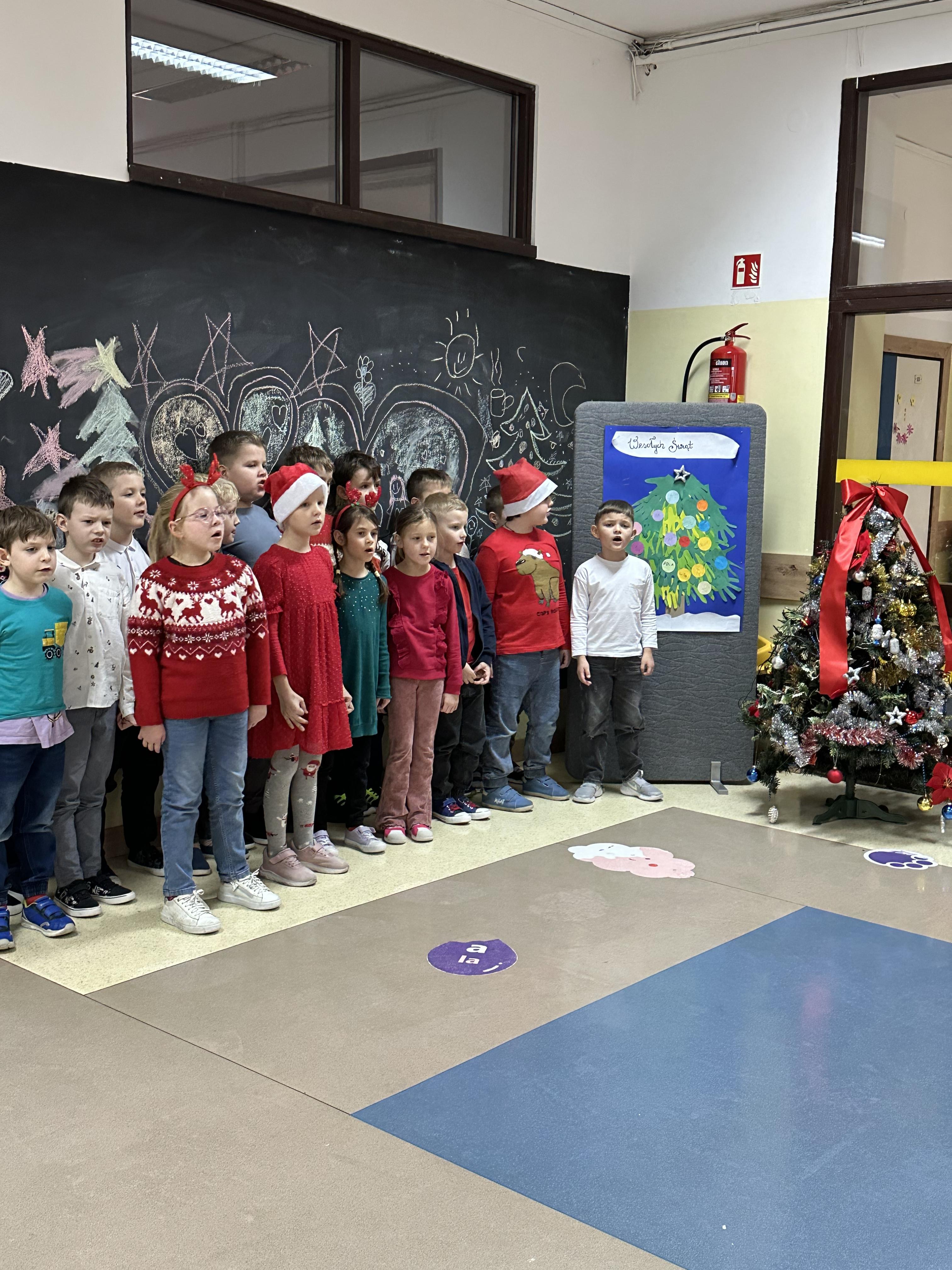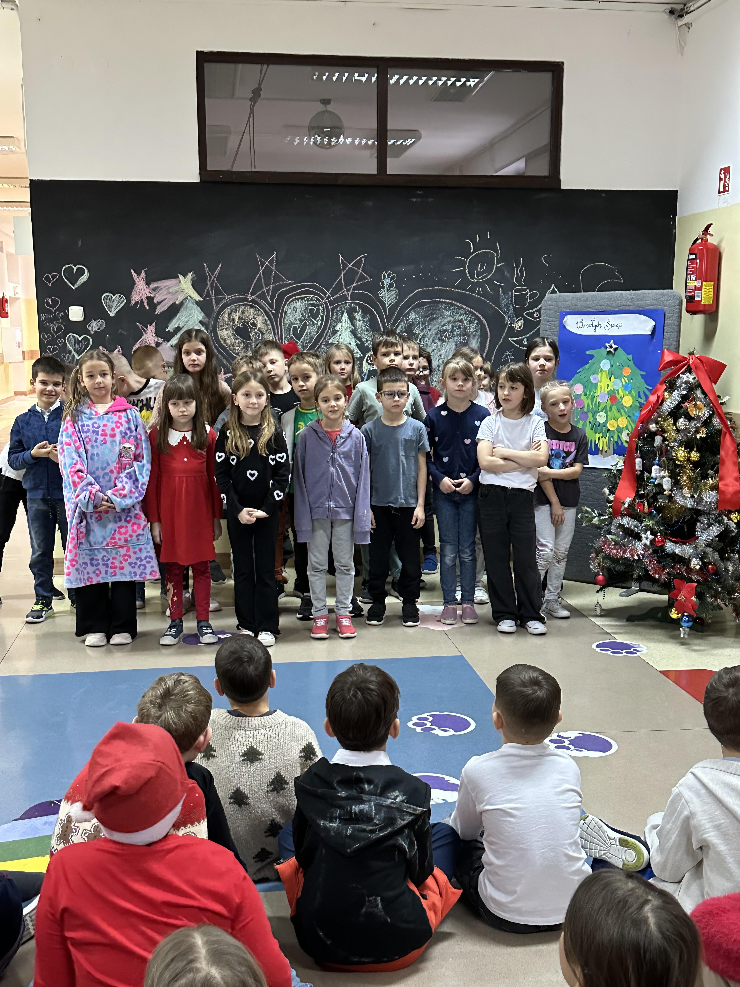Dzieci z wielkim zaangażowaniem i radością śpiewały znane utwory, tworząc wyjątkową, pełną ciepła i świątecznego nastroju atmosferę. Był to czas wspólnego przeżywania magii Świąt Bożego Narodzenia, integracji oraz pielęgnowania tradycji i wartości, które łączą pokolenia.