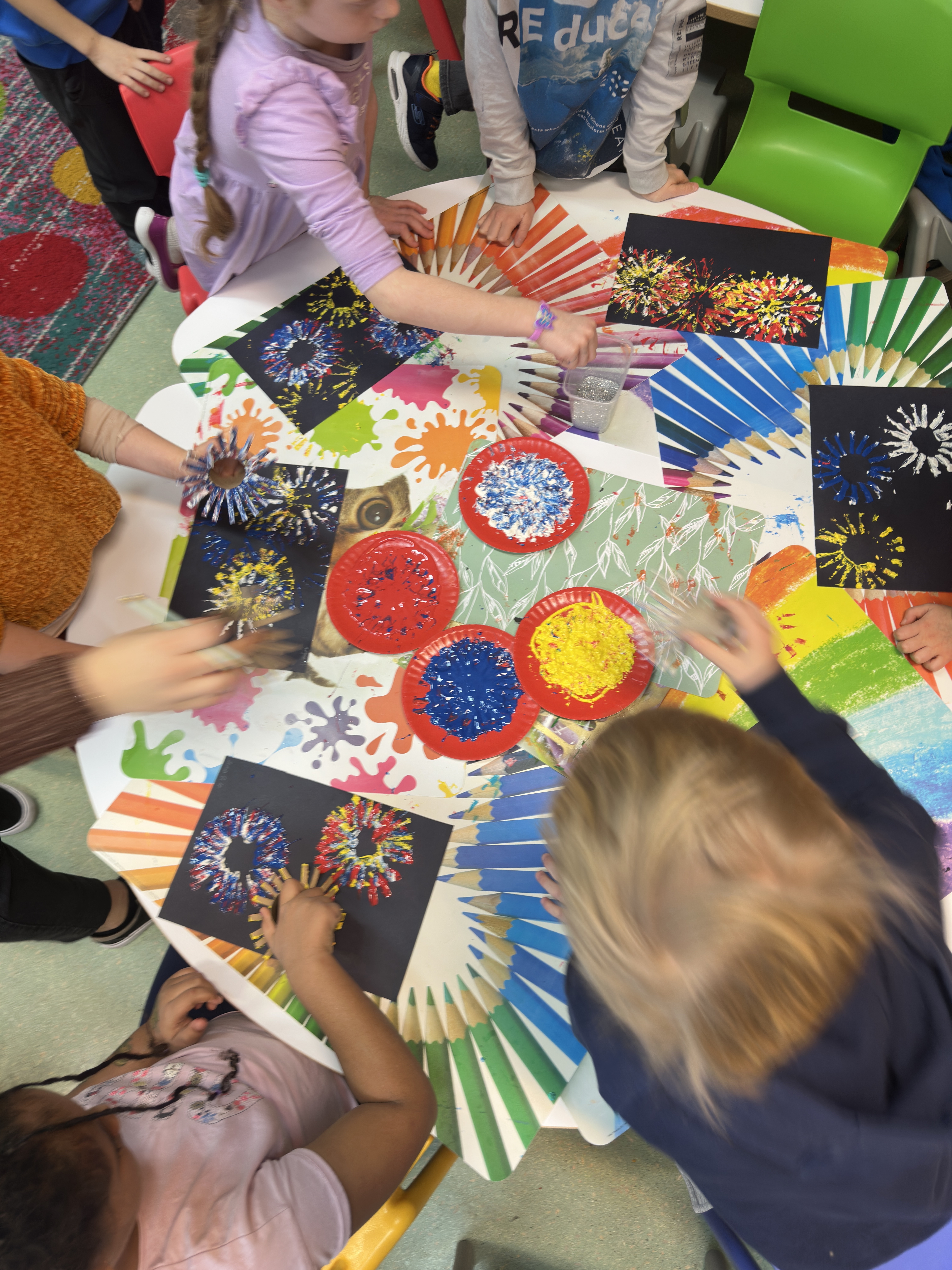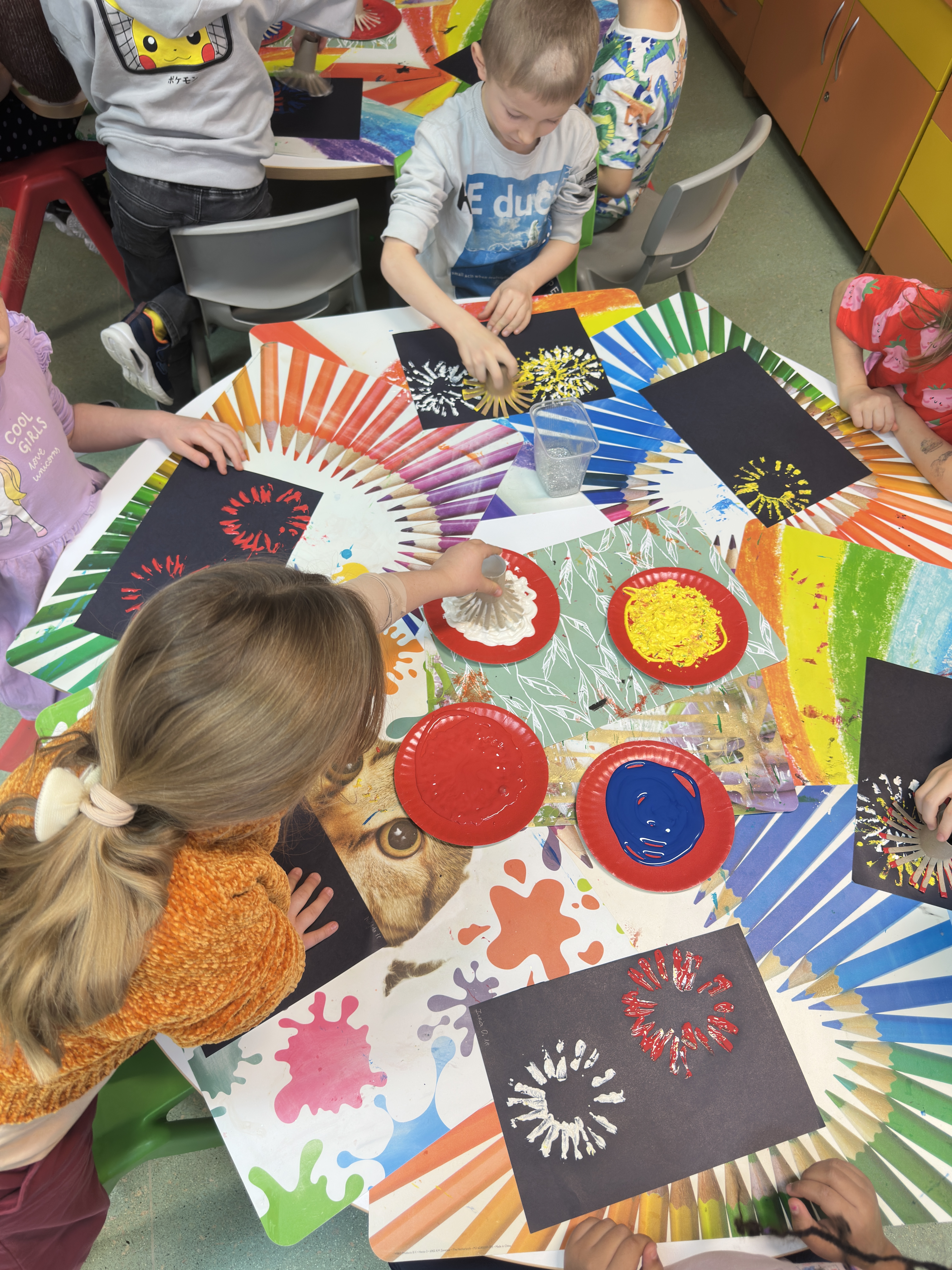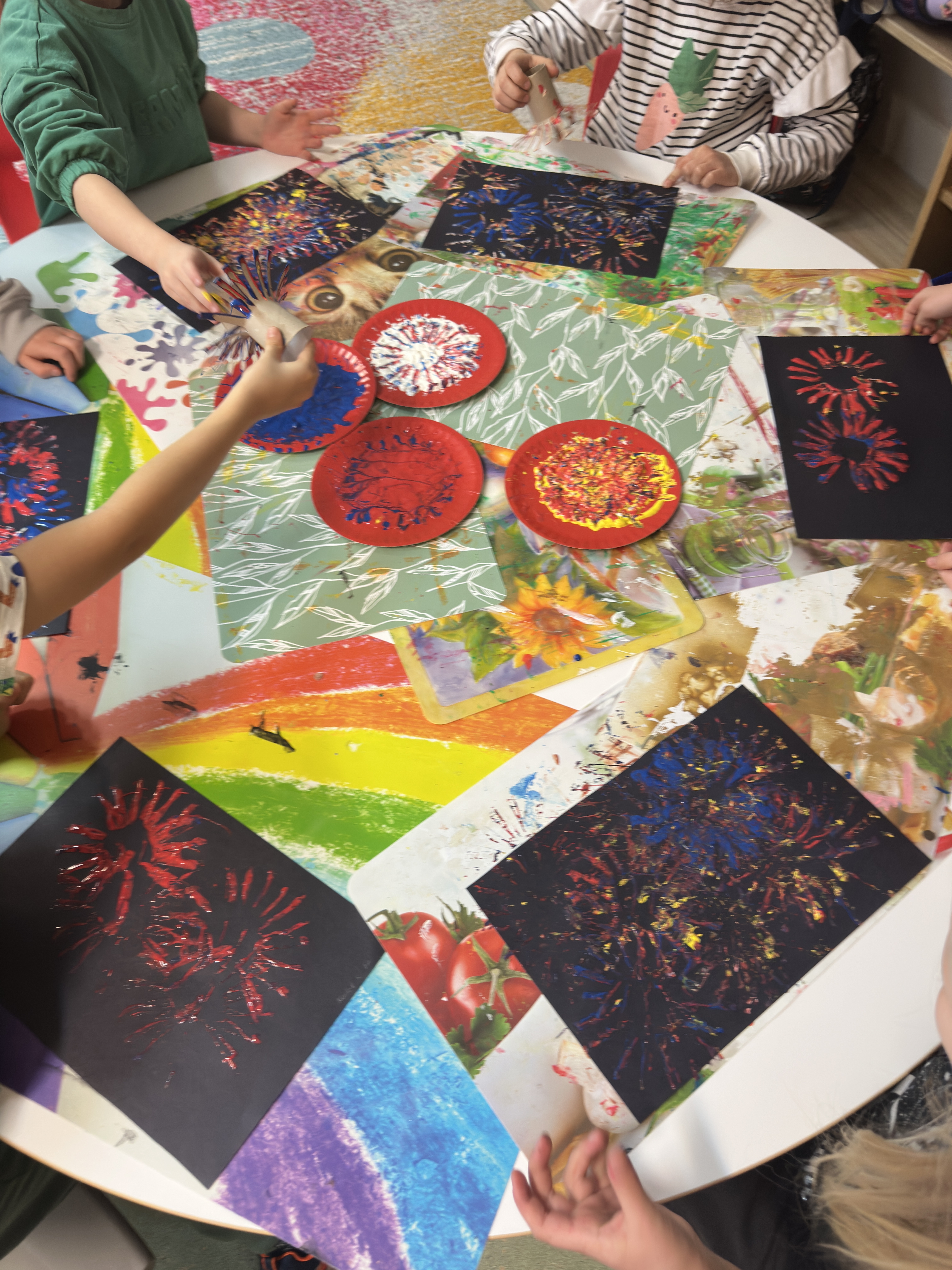 Z okazji Nowego Roku podczas zajęć plastycznych uczniowie przenieśli się w świat kolorów, wyobraźni i radosnego eksperymentowania. Tematem przewodnim były „Fajerwerki”, a główną techniką – stemplowanie, które dostarczyło dzieciom mnóstwo twórczej zabawy.