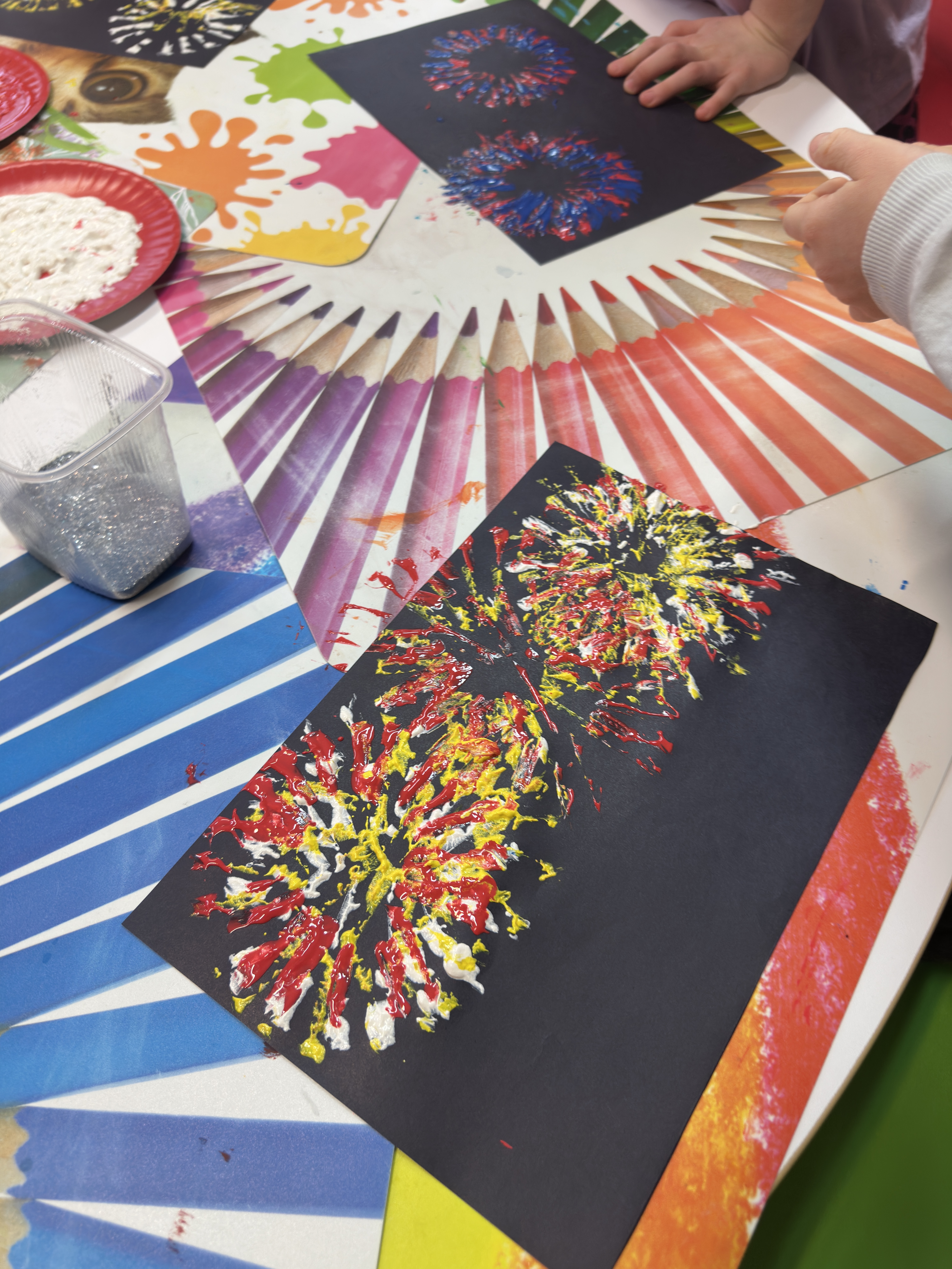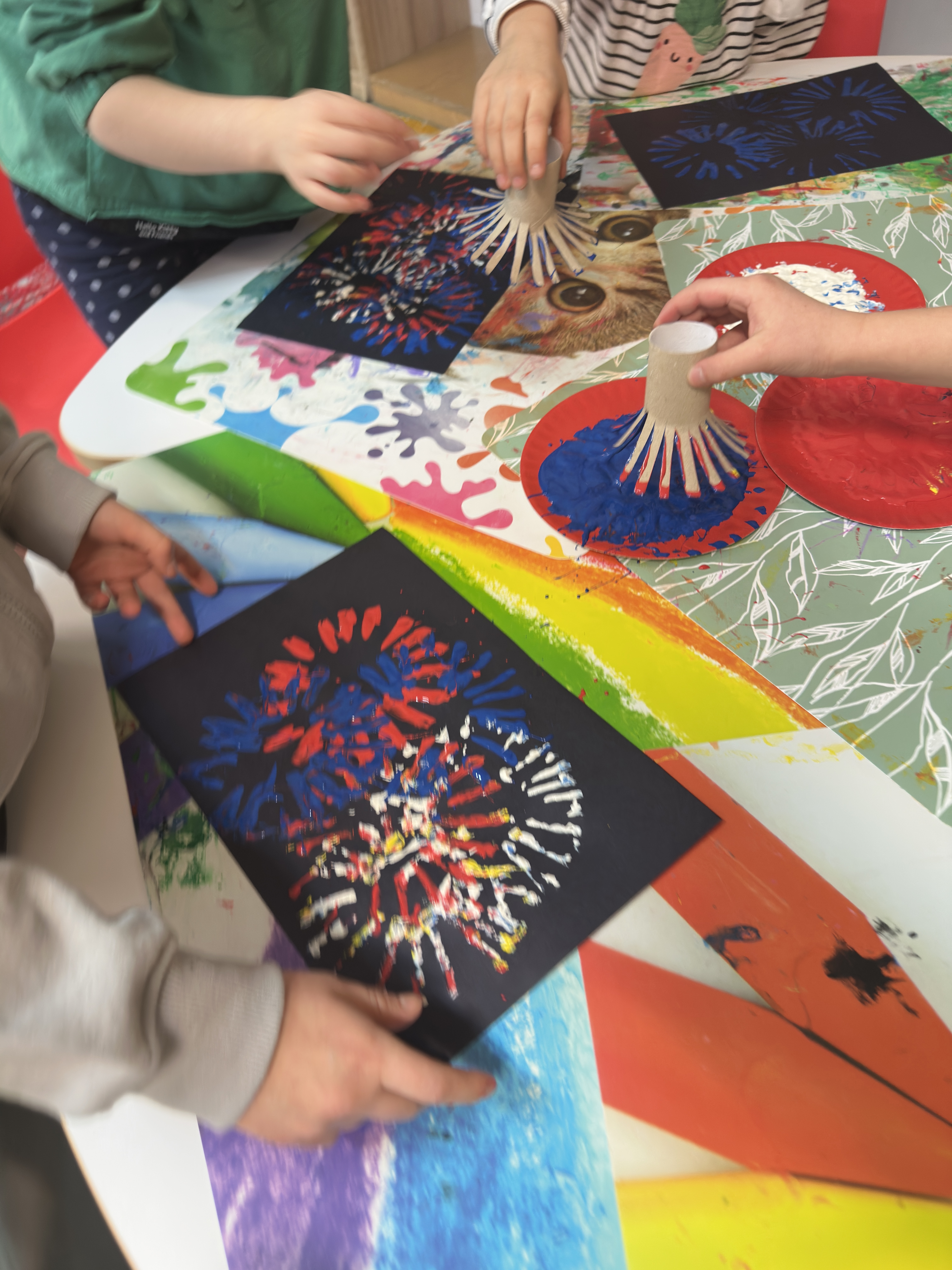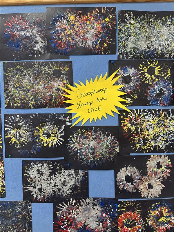 Przy użyciu farb i różnorodnych stempli powstały barwne, dynamiczne kompozycje przypominające rozświetlone noworoczne niebo. Zajęcia rozwijały kreatywność, sprawność manualną oraz wrażliwość estetyczną, a jednocześnie pozwoliły dzieciom swobodnie wyrażać emocje i radość z nadejścia Nowego Roku.
