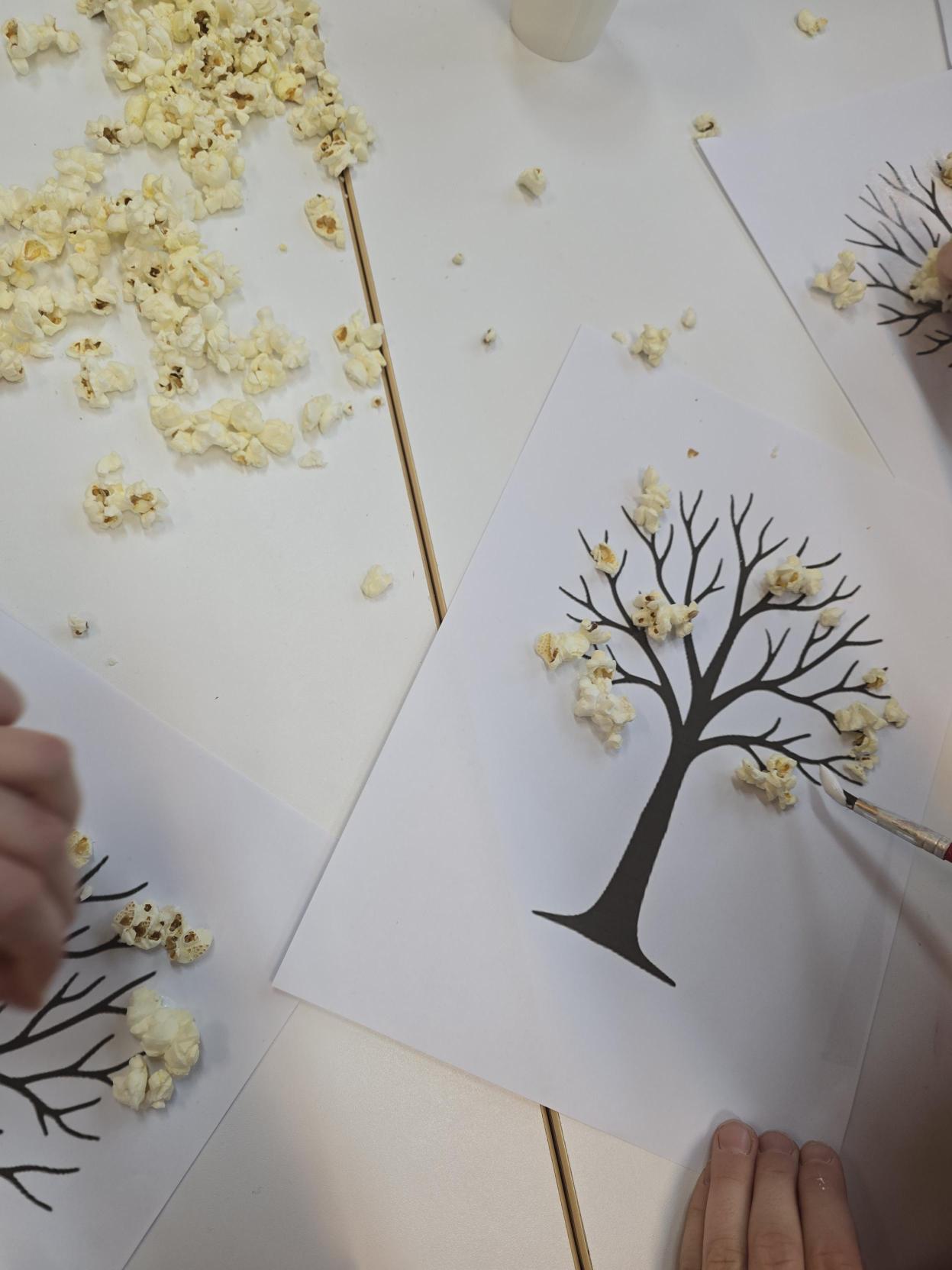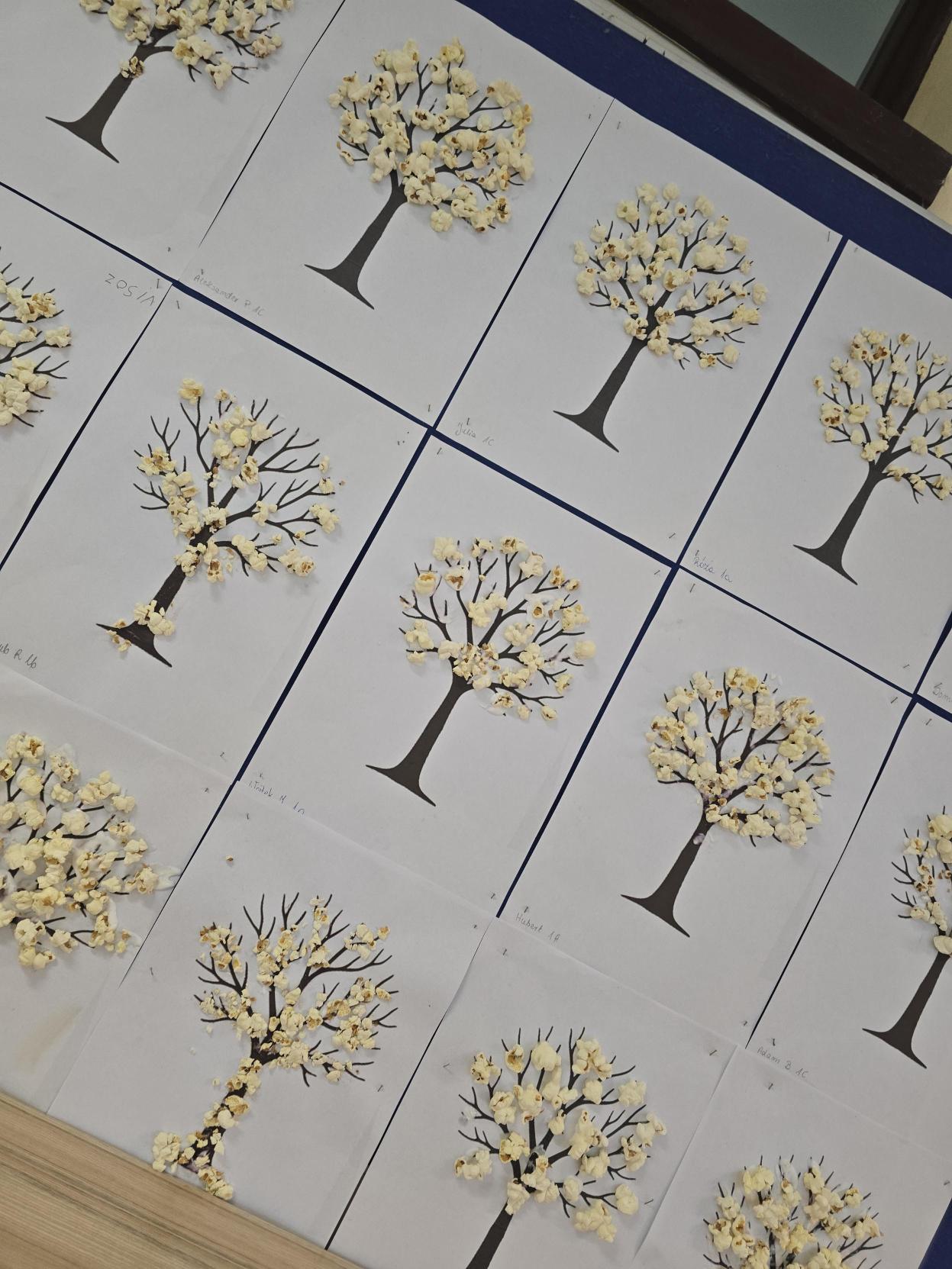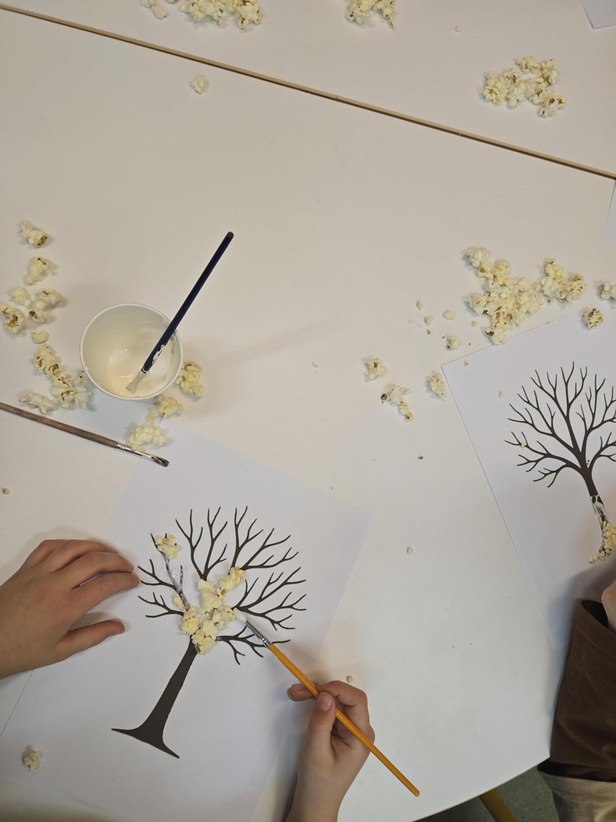 Uczniowie wykonali zimowe drzewka wykorzystując klej oraz popcorn który imitował śnieg na gałęziach. Zostały zastosowane metody aktywizujące następujące: metoda praktycznego działania poprzez nakładanie kleju, dobrania miejsca i przyklejania popcornu ucząc się przez działanie. Zastosowano również metodę sensoryczną - kontakt z różnymi fakturami pobudzając zmysły i integrację sensoryczną. Zastosowano metodę indywidualizacji - dzieci pracowały w swoim własnym tempie i wg własnego pomysłu.