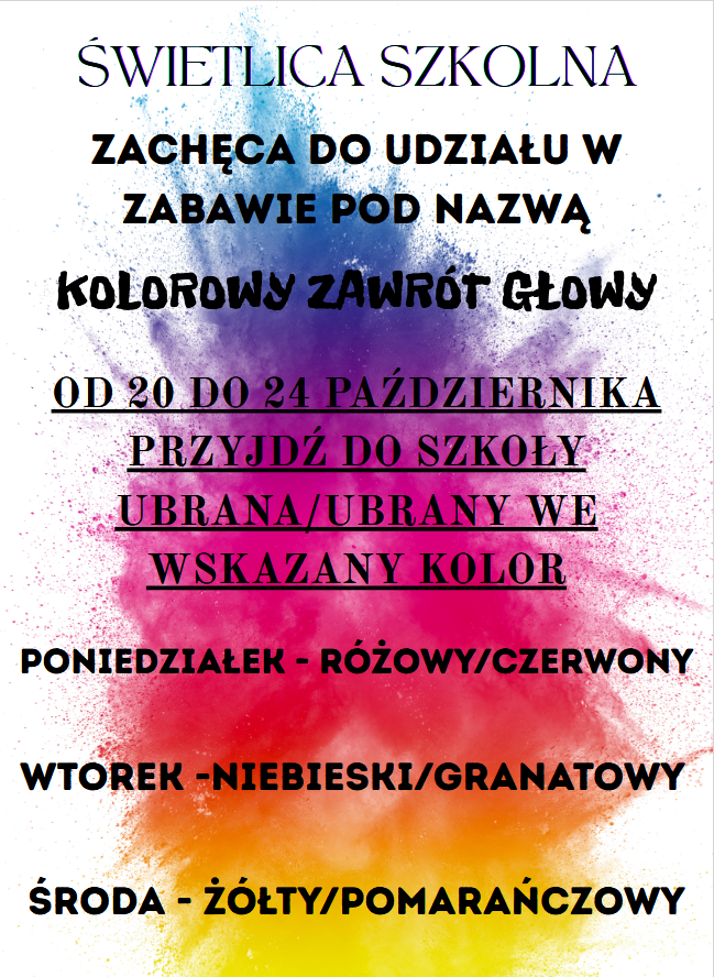ŚWIETLICA SZKOLNA zachęca do udziału w zabawie pod nazwąKOLOROWY ZAWRÓT GŁOWYOD 20 DO 24 PAŹDZIERNIKA PRZYJDŹ DO SZKOŁY UBRANA/UBRANY WE WSKAZANY KOLOR