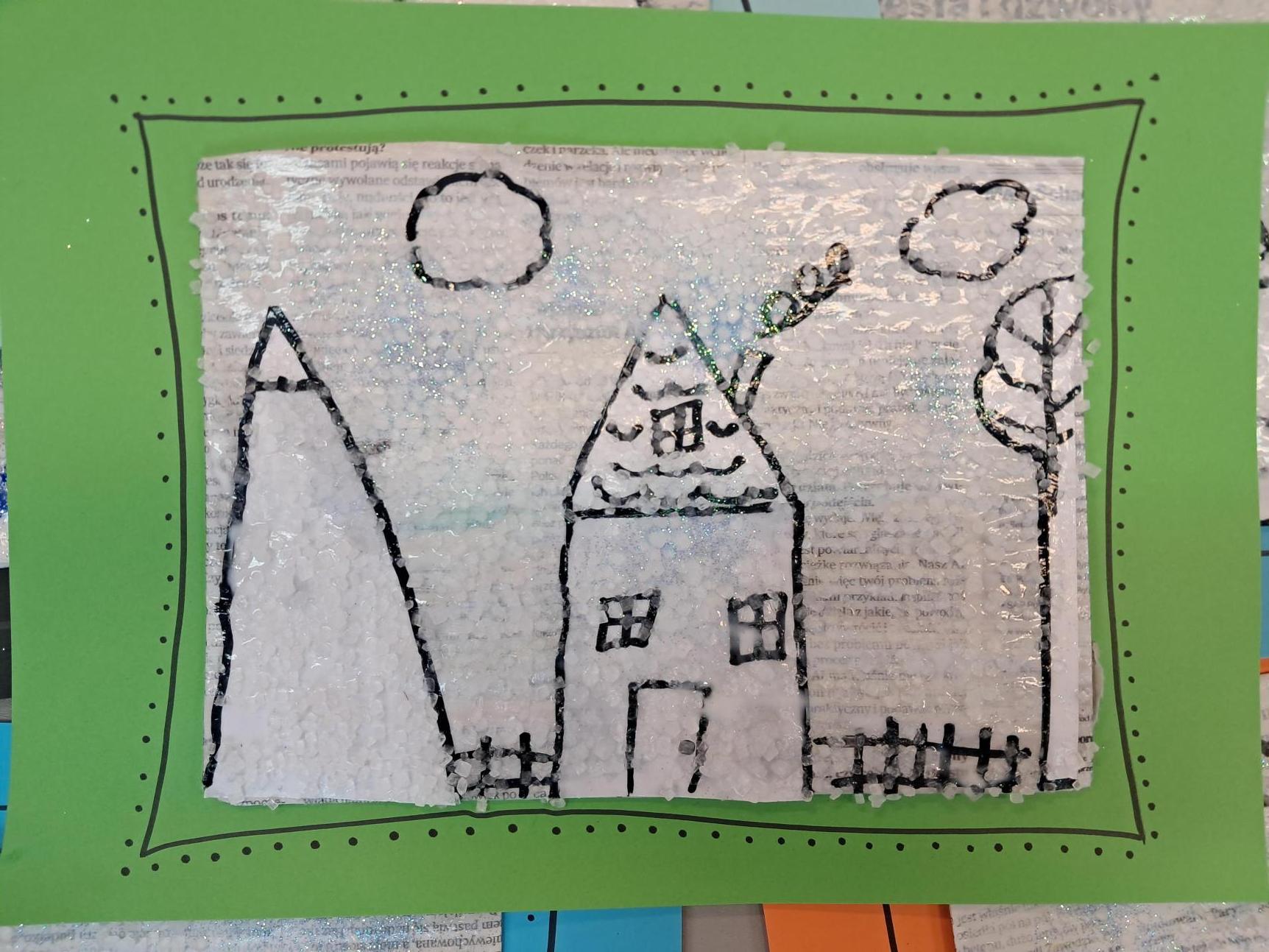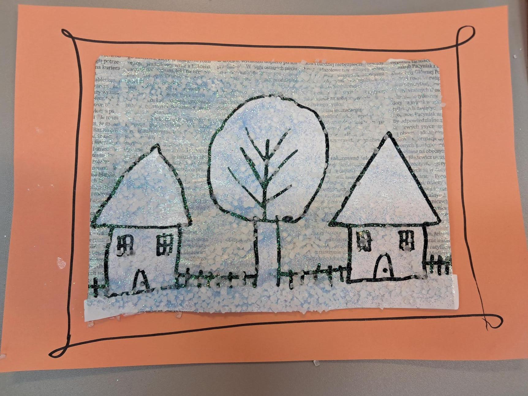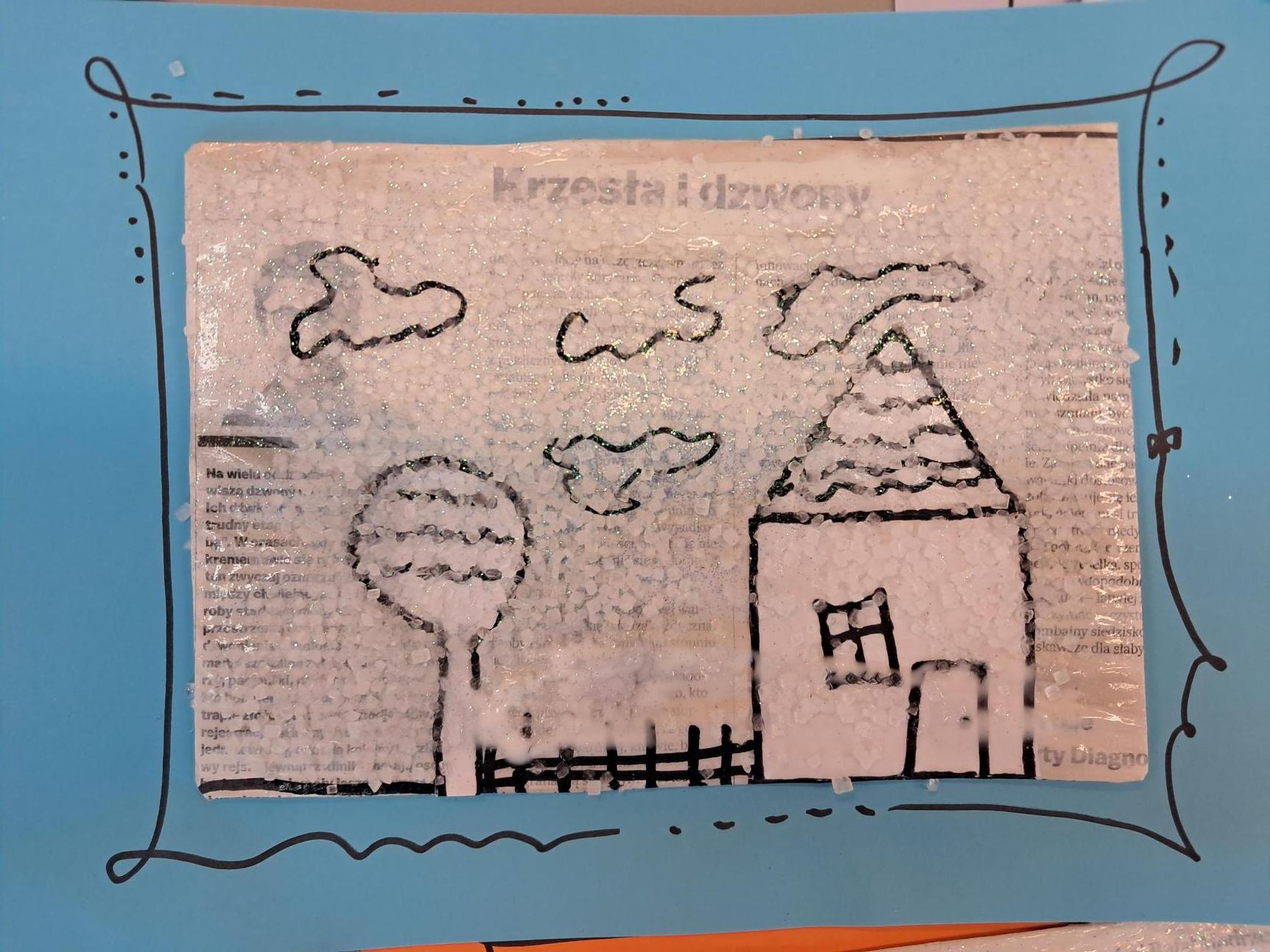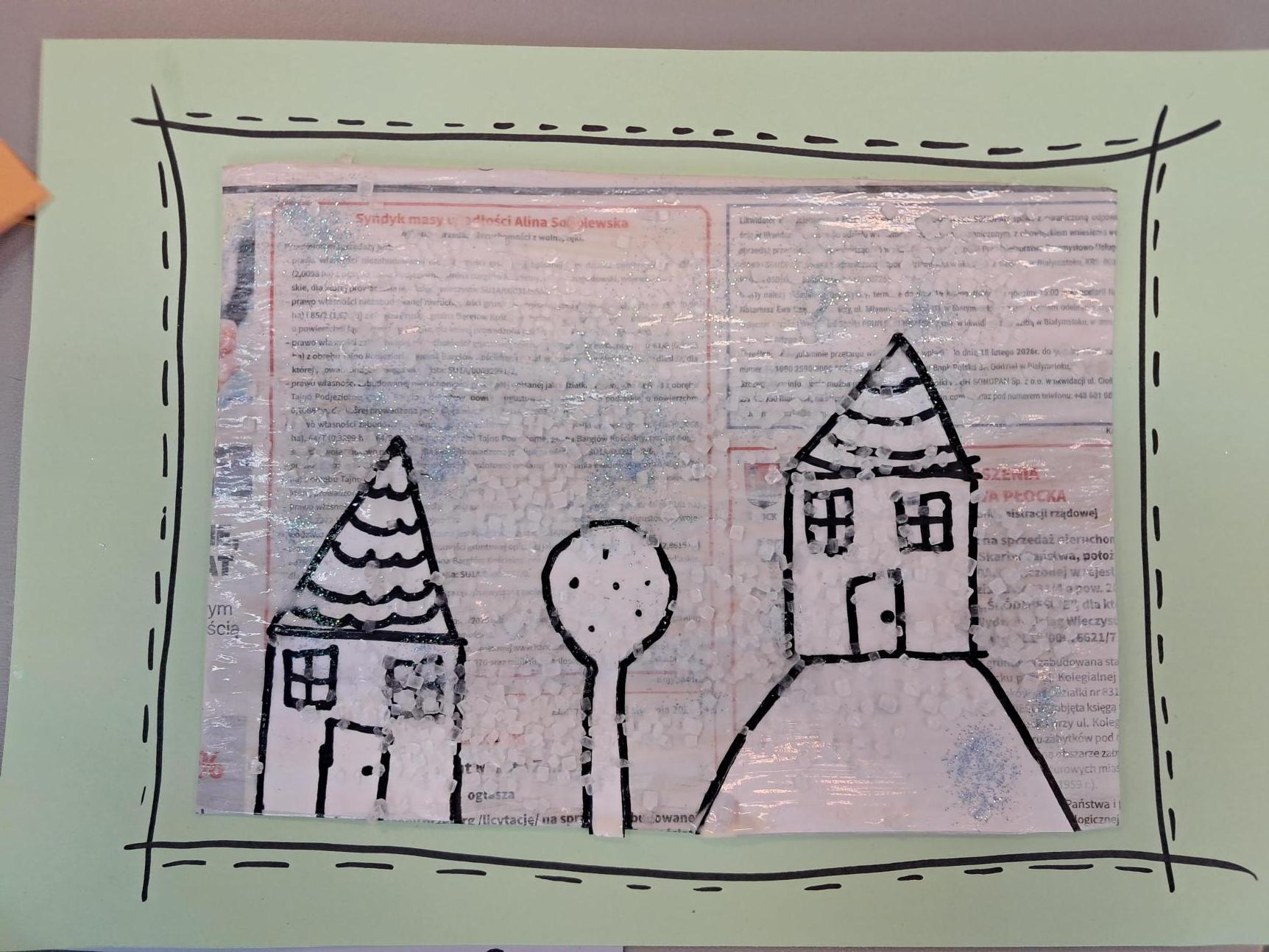 Podczas zajęć dzieci tworzyły zimowe pejzaże, eksperymentując z fakturą i kolorem. Gazety posłużyły do budowania tła i form, cukier imitował śnieg, a brokat dodał pracom blasku i efektu mroźnej aury. Zajęcia rozwijały kreatywność, sprawność manualną oraz wyobraźnię, a jednocześnie sprawiły uczniom wiele radości.