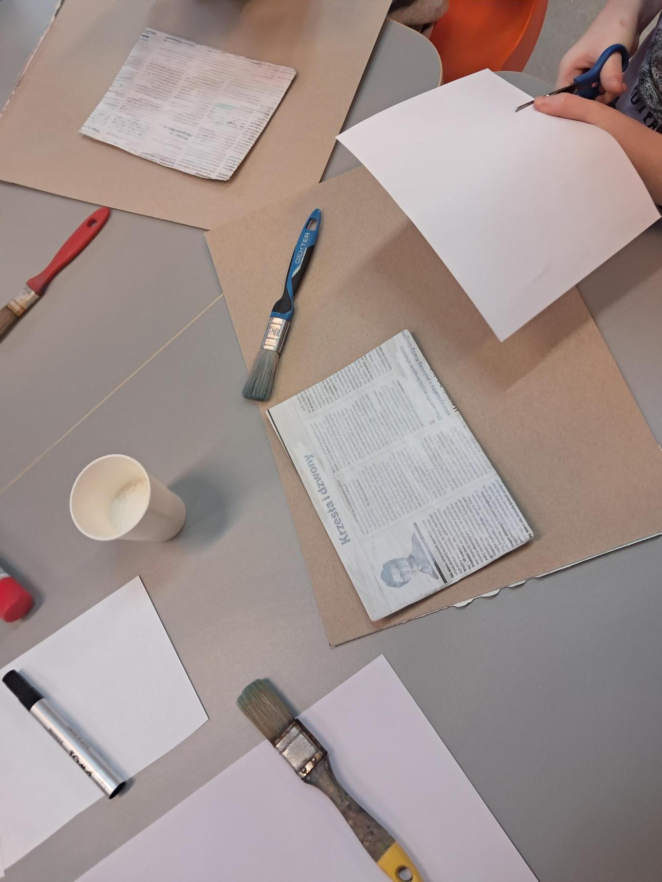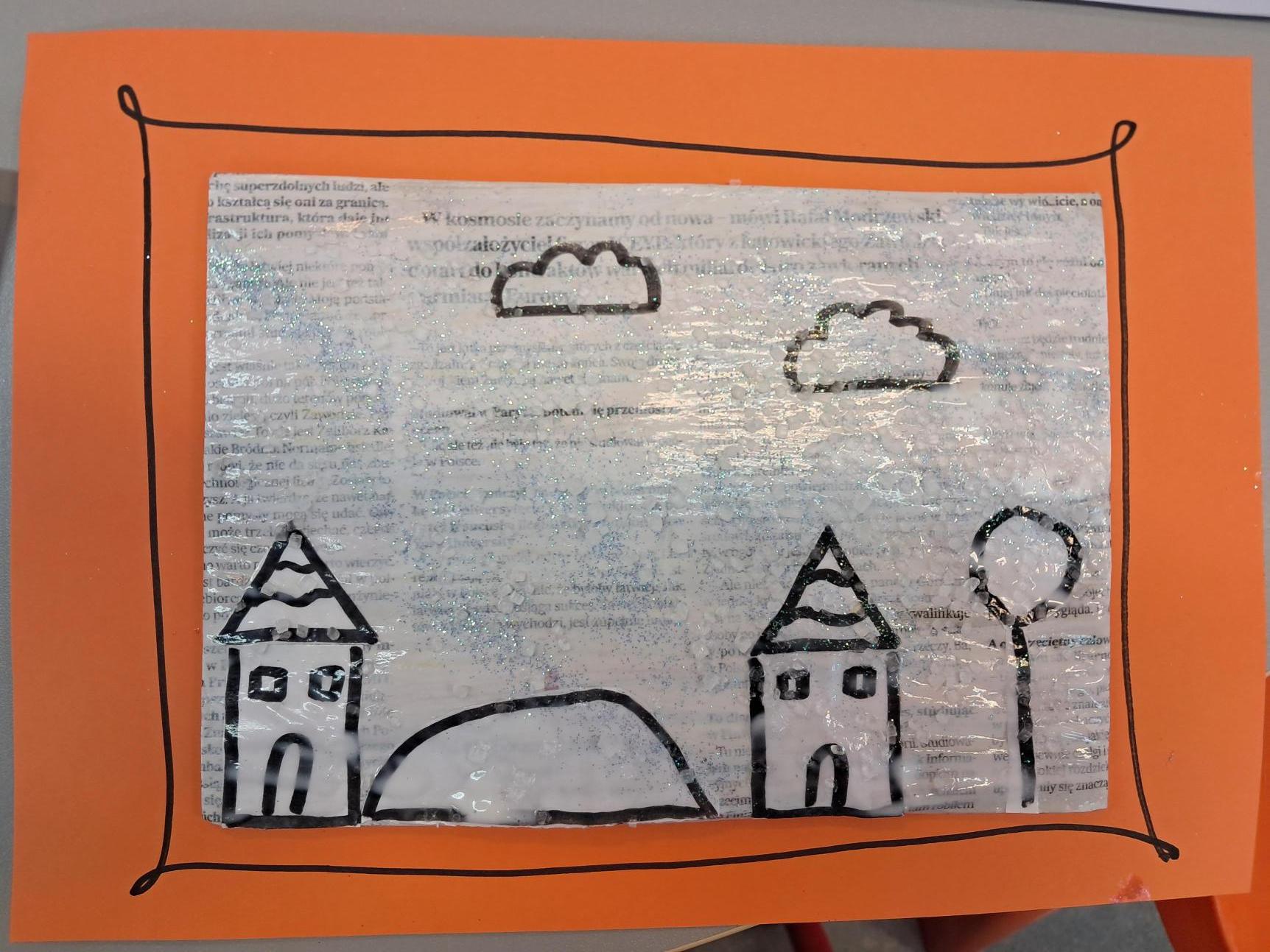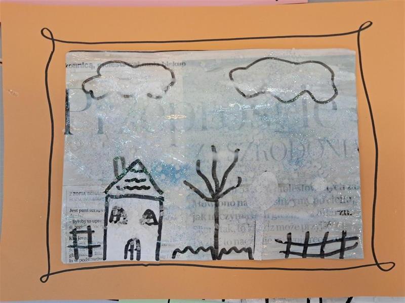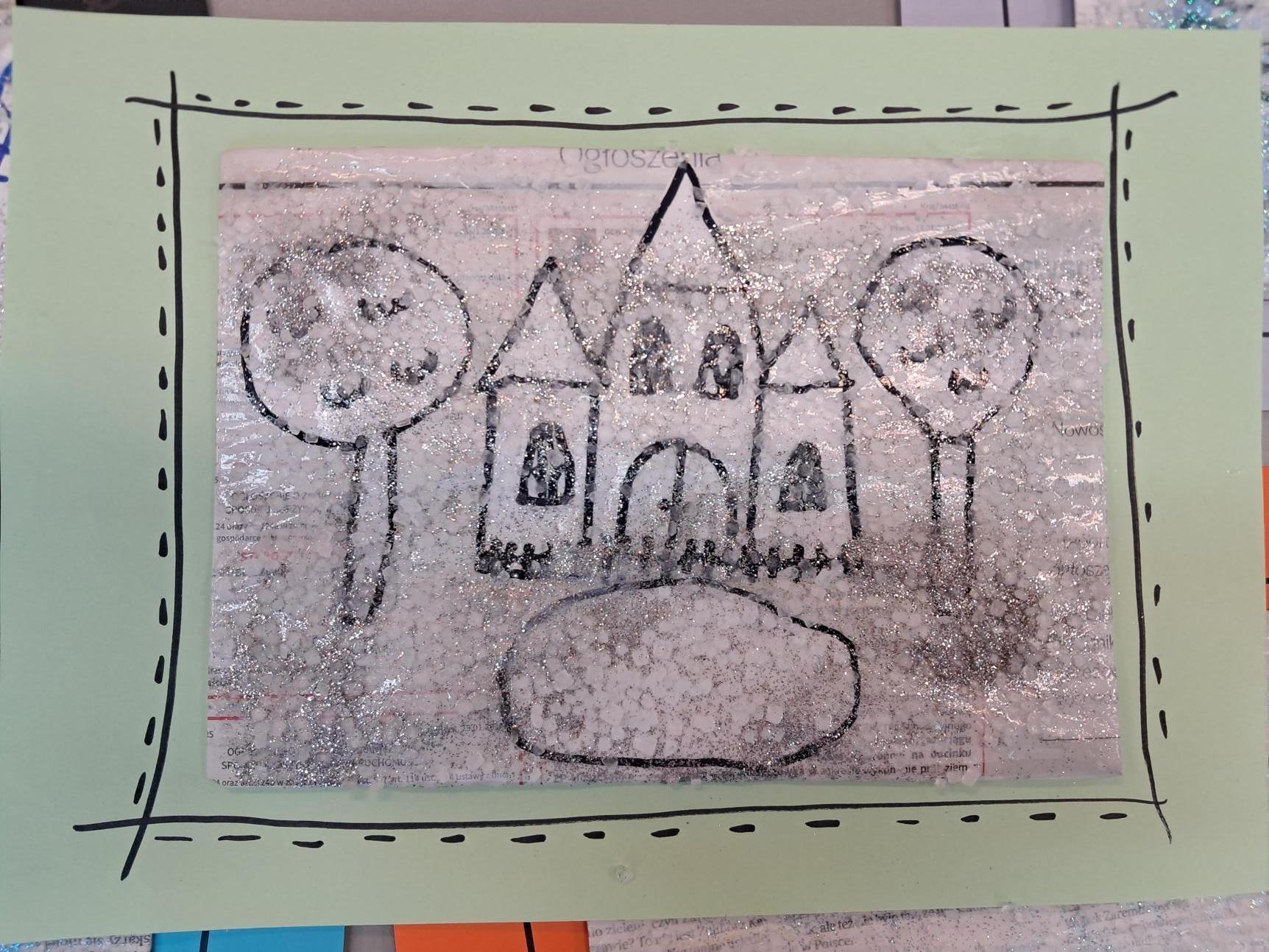 Podczas zajęć dzieci tworzyły zimowe pejzaże, eksperymentując z fakturą i kolorem. Gazety posłużyły do budowania tła i form, cukier imitował śnieg, a brokat dodał pracom blasku i efektu mroźnej aury. Zajęcia rozwijały kreatywność, sprawność manualną oraz wyobraźnię, a jednocześnie sprawiły uczniom wiele radości.